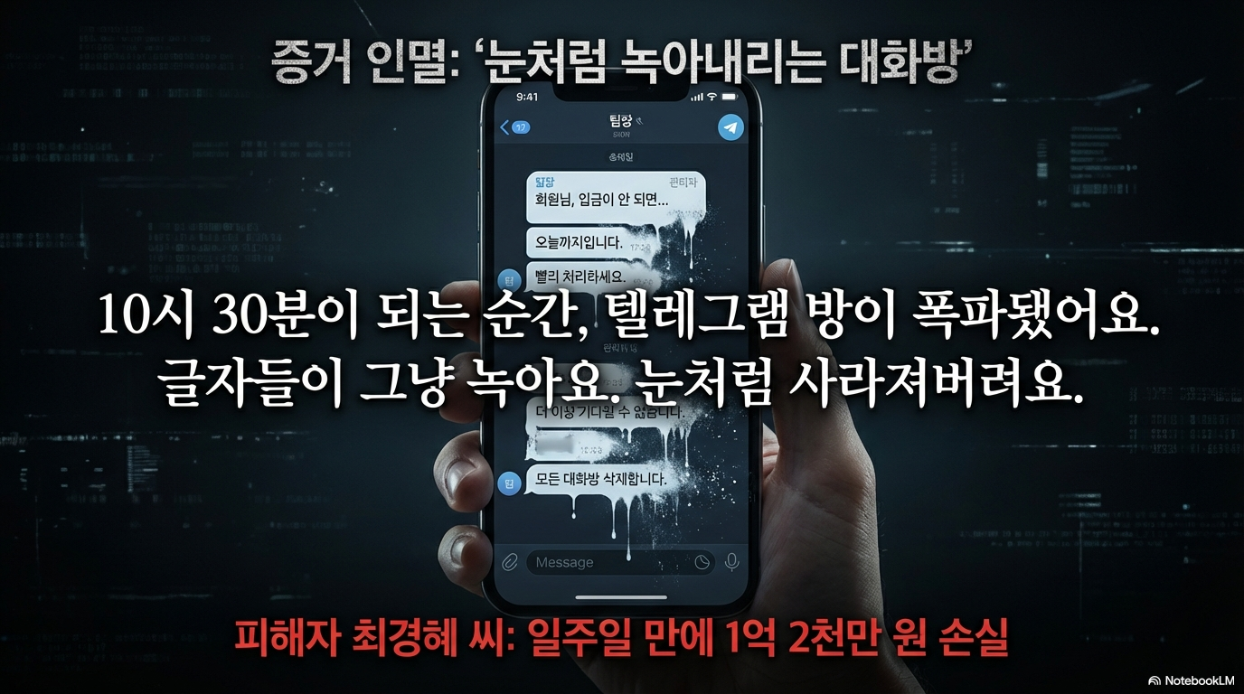 학원을 운영하던 최경혜 씨 역시 이 수법에 휘말려 일주일 만에 1억 2천만 원을 탈취당했습니다. 그녀가 하차를 선언하자마자 활발하던 텔레그램 대화방은 "눈처럼 녹아내리듯" 순식간에 삭제되었고, 남은 것은 허탈함과 거액의 빚뿐이었습니다.