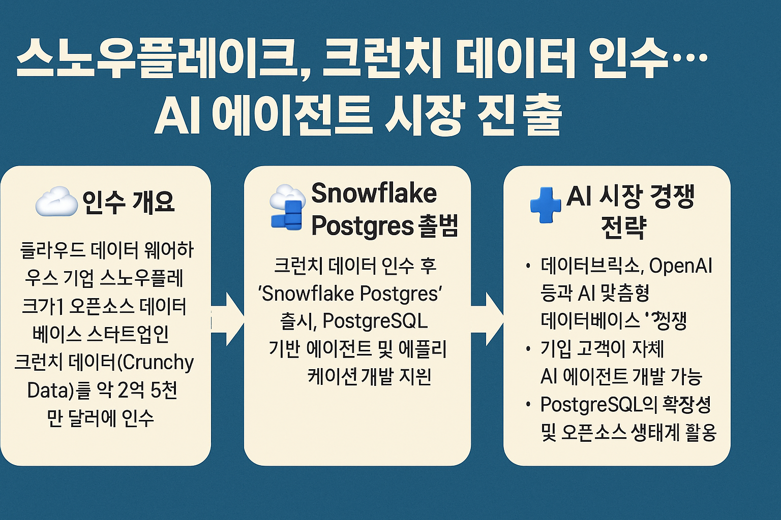 이에 맞서 스노우플레이크는 약 2억 5천만 달러 규모로 **크런치 데이터(Crunchy Data)**를 인수하며 반격에 나섰습니다. 크런치 데이터 역시 PostgreSQL 전문 기업으로, 특히 보안성과 안정성 측면에서 강점을 가져 정부기관 및 대기업 고객을 확보하고 있던 기업입니다. 스노우플레이크는 이를 통해 Snowflake Postgres라는 새로운 서비스를 런칭하고, PostgreSQL 기반 AI 에이전트 및 애플리케이션 개발을 가속화할 계획입니다.