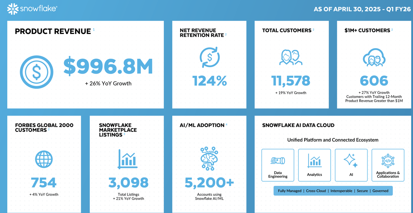 특히 2025 회계연도 1분기 실적 발표에서, 스노우플레이크는 사상 처음으로 분기 매출 10억 달러를 돌파하며 시장의 기대를 넘어서는 성과를 보여주었습니다. 이는 단순한 일회성 이벤트가 아니라, AI 중심 기능을 중심으로 한 고객 확장이 실질적인 매출 성장으로 연결되고 있음을 보여주는 지표입니다. 회사는 현재 약 5,200개 이상의 고객사가 매주 자사의 AI 기능을 활용 중이라고 밝혔으며, 이는 Snowpark, Cortex, LLM 연결 기능 등을 포함하는 전체 AI 포트폴리오의 활용도가 급증하고 있음을 시사합니다.