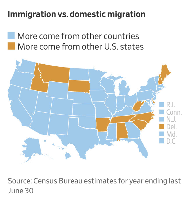 게다가 캘리포니아만의 이야기가 아닙니다. 2024년 기준으로 미국 16개 주는 이민자가 없었다면 인구가 줄었을 것이며, 38개 주 및 워싱턴 D.C.에서는 해외 이민이 국내 이주를 상회했습니다. 미국 전역이 이민을 통한 인구 유지의 시대로 접어든 것입니다.