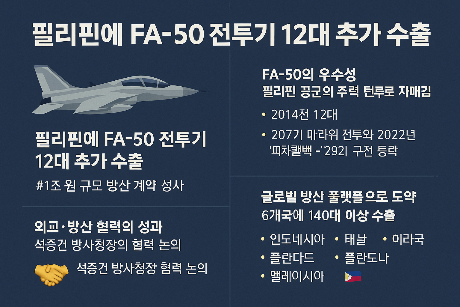 2025년 6월, 한국 방위산업이 다시 한 번 전 세계의 주목을 받았습니다. **한국항공우주산업(KAI)**이 필리핀과 총 7억 달러, 약 1조 원 규모의 FA-50 전투기 12대 수출 계약을 성사시키며, 올해 들어 가장 큰 규모의 방산 수출을 기록한 것입니다. 이번 계약은 단순한 기체 판매 이상의 의미를 지닙니다.