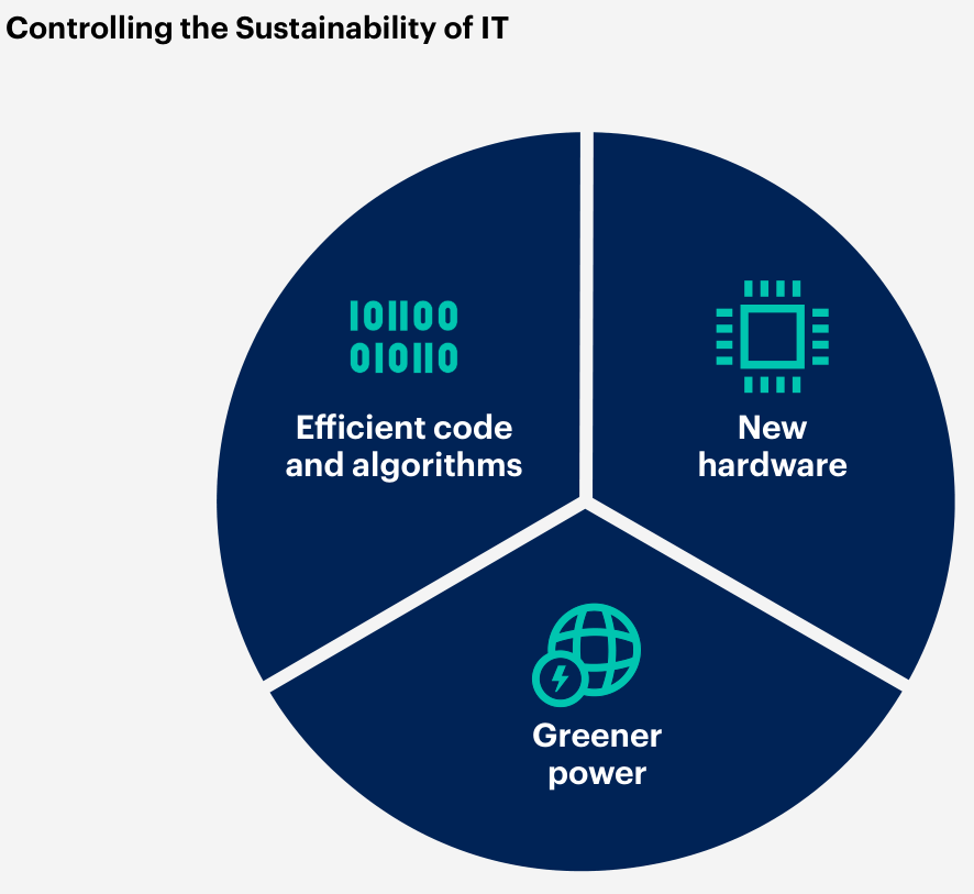Gartner에 따르면 오늘날 IT 조직에서 가장 큰 고려 사항 중 하나는 탄소 발자국(carbon footprint)입니다. 이를 해결하기 위해 기업들은 더 효율적인 코드와 알고리즘, 그린 에너지원 사용, 그리고 새로운 하드웨어를 통해 IT 시스템의 전반적인 에너지 소비를 줄여야 합니다. 예를 들어, 스마트 오피스 빌딩은 IoT 센서를 통해 실시간으로 공간 점유율을 추적하고, 실제 필요에 따라 조명, HVAC(난방, 환기, 에어컨 시스템), 장비 사용을 조정함으로써 상당한 비용 절감과 탄소 배출 감소를 달성할 수 있습니다.