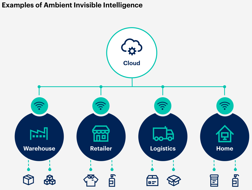 주변 지능은 저비용의 작은 태그와 센서를 사용해 물체나 환경의 위치 및 상태를 실시간으로 추적하고 데이터를 수집하는 기술을 말합니다. 이러한 기술은 대부분의 일상적인 물체에 내장되며, 사용자는 그 존재를 인식하지 못할 정도로 일상화됩니다. 수집된 데이터는 클라우드로 전송되어 분석되고 기록되며, 이는 기업이 비즈니스 운영을 효율적으로 관리하는 데 중요한 역할을 합니다.