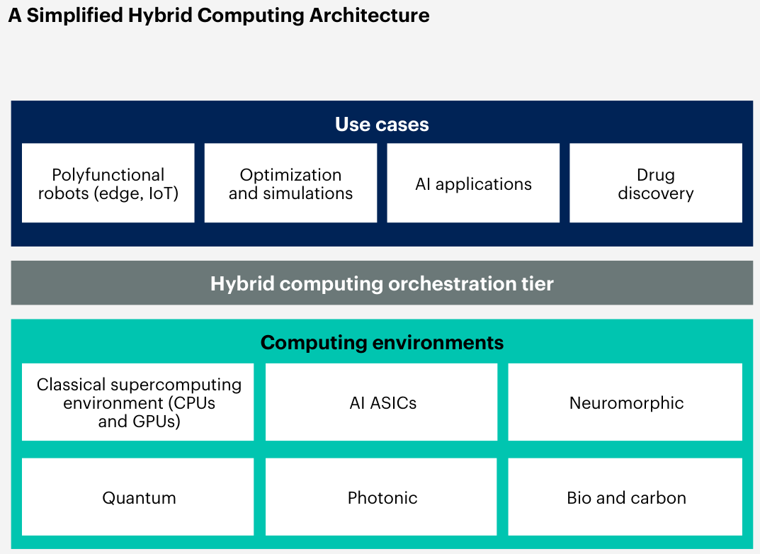 하이브리드 컴퓨팅은 CPU, GPU, 엣지 장치, ASIC(응용특화집적회로), 신경모방 컴퓨팅(neuromorphic computing), 양자 컴퓨팅(quantum computing), 광자 컴퓨팅(photonic computing)과 같은 다양한 컴퓨팅 기술을 조합해 복잡한 문제를 해결하는 컴퓨팅 환경을 말합니다. 각 기술은 특정한 강점을 가지고 있으며, 이를 결합하여 전통적인 컴퓨팅 방식으로는 해결할 수 없는 복잡한 계산 작업을 효율적으로 처리할 수 있습니다.