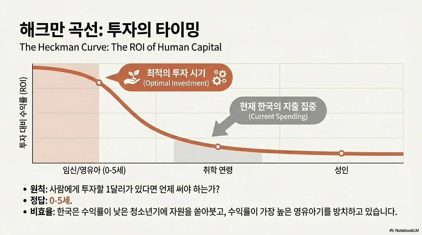 경제학에는 ‘헤크만 곡선(Heckman Curve)’이라는 유명한 이론이 있습니다. 이 곡선은 한 사람의 인생 주기에 따라 ‘투자 대비 효과(ROI)’가 어떻게 변하는지를 명확하게 보여줍니다. 놀랍게도, 인생에서 투자의 효과가 가장 극적으로 나타나는 시기는 바로 임신기부터 만 5세까지의 영유아기입니다.