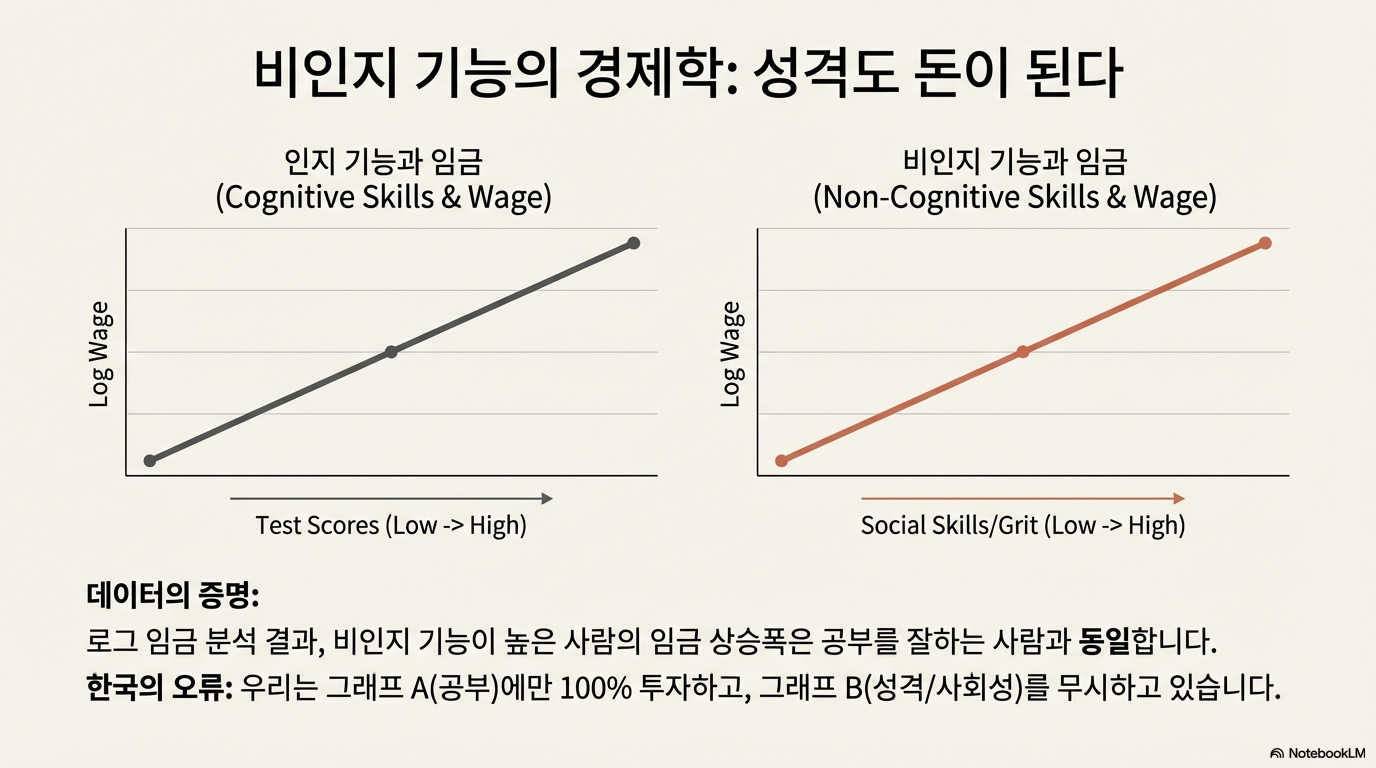많은 사람들이 이런 덕목을 ‘있으면 좋은 것’ 정도로 생각하지만, 데이터는 전혀 다른 이야기를 합니다. 김 교수가 제시한 그래프에 따르면, 한 사람의 미래 소득에 미치는 영향력은 인지 기능(공부 능력)과 비인지 기능이 거의 동일합니다. 그는 "양쪽 그래프의 기울기가 비슷하죠"라고 지적하며, 두 능력의 중요성이 사실상 같다는 것을 보여줍니다.
