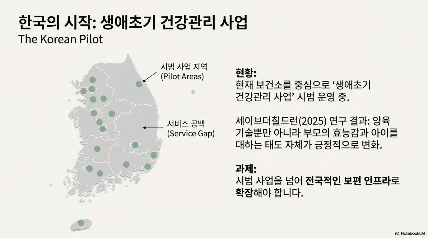 이것이 바로 국가가 먼저 움직이는 ‘보편적 가정 방문 서비스’입니다. 도움이 절실하지만 스스로 요청할 힘조차 없는 가정을 찾아내는 가장 효과적인 시스템입니다. 반면, 한국은 여전히 당사자가 직접 기관의 문을 두드려야만 지원이 이루어지는 ‘신청주의’의 한계에 갇혀 있습니다.