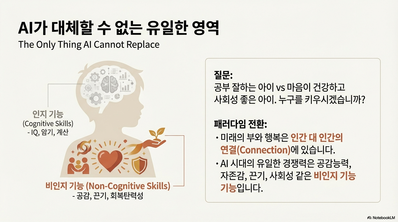 대한민국 부모들의 마음은 불안합니다. 한쪽에서는 살인적인 입시 경쟁이 아이들을 압박하고, 다른 한쪽에서는 인공지능(AI)이 인간의 일자리를 대체할 것이라는 예측이 쏟아져 나옵니다. 아이의 미래를 위해 무엇을 어떻게 준비해야 할지 혼란스러운 것은 당연합니다. 모두가 ‘더 열심히, 더 많이’를 외칠 때, 우리는 어떤 길을 선택해야 할까요?