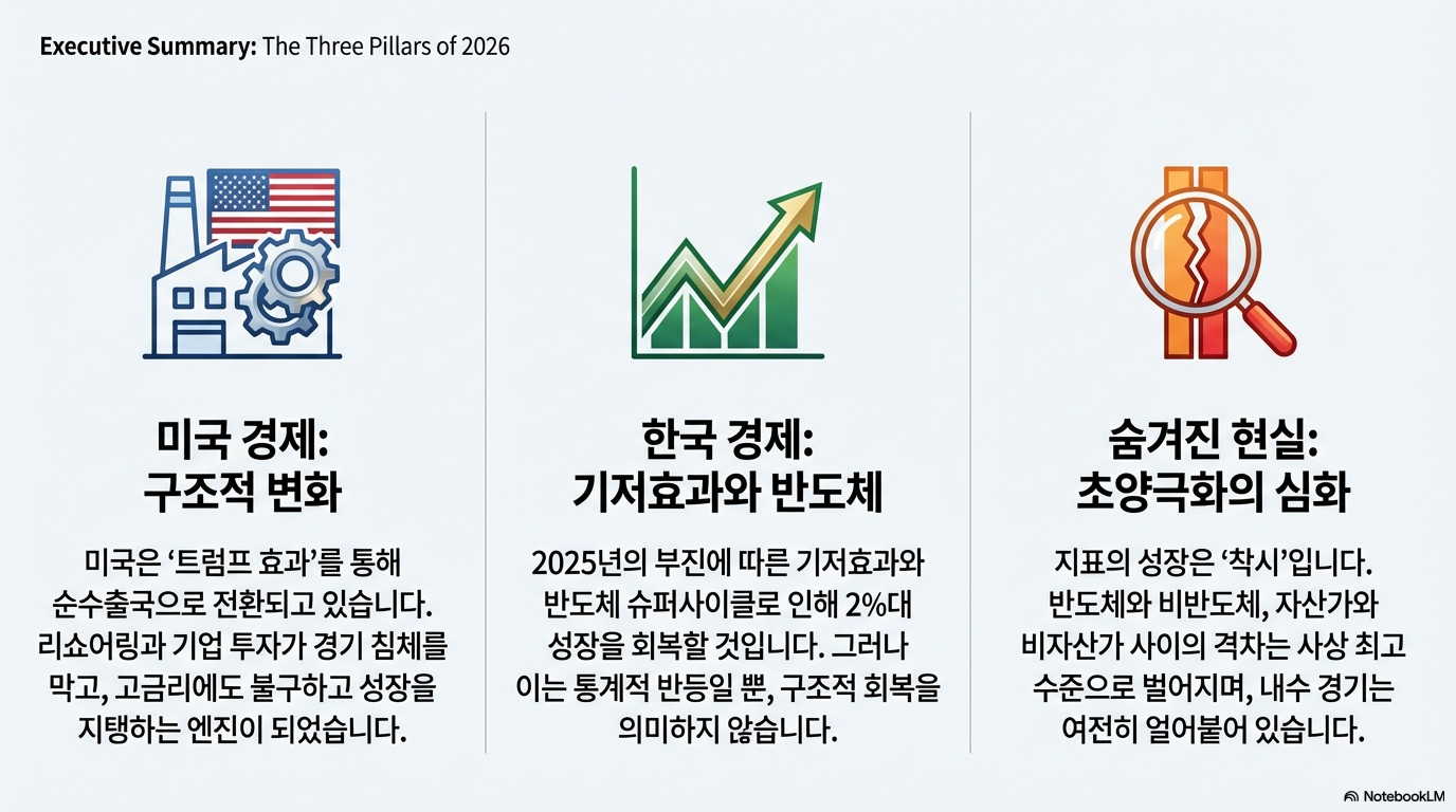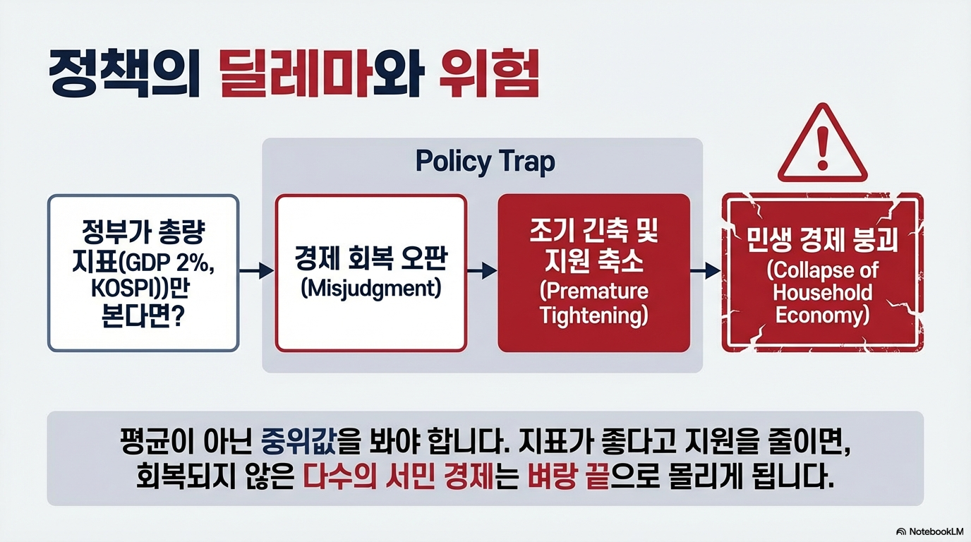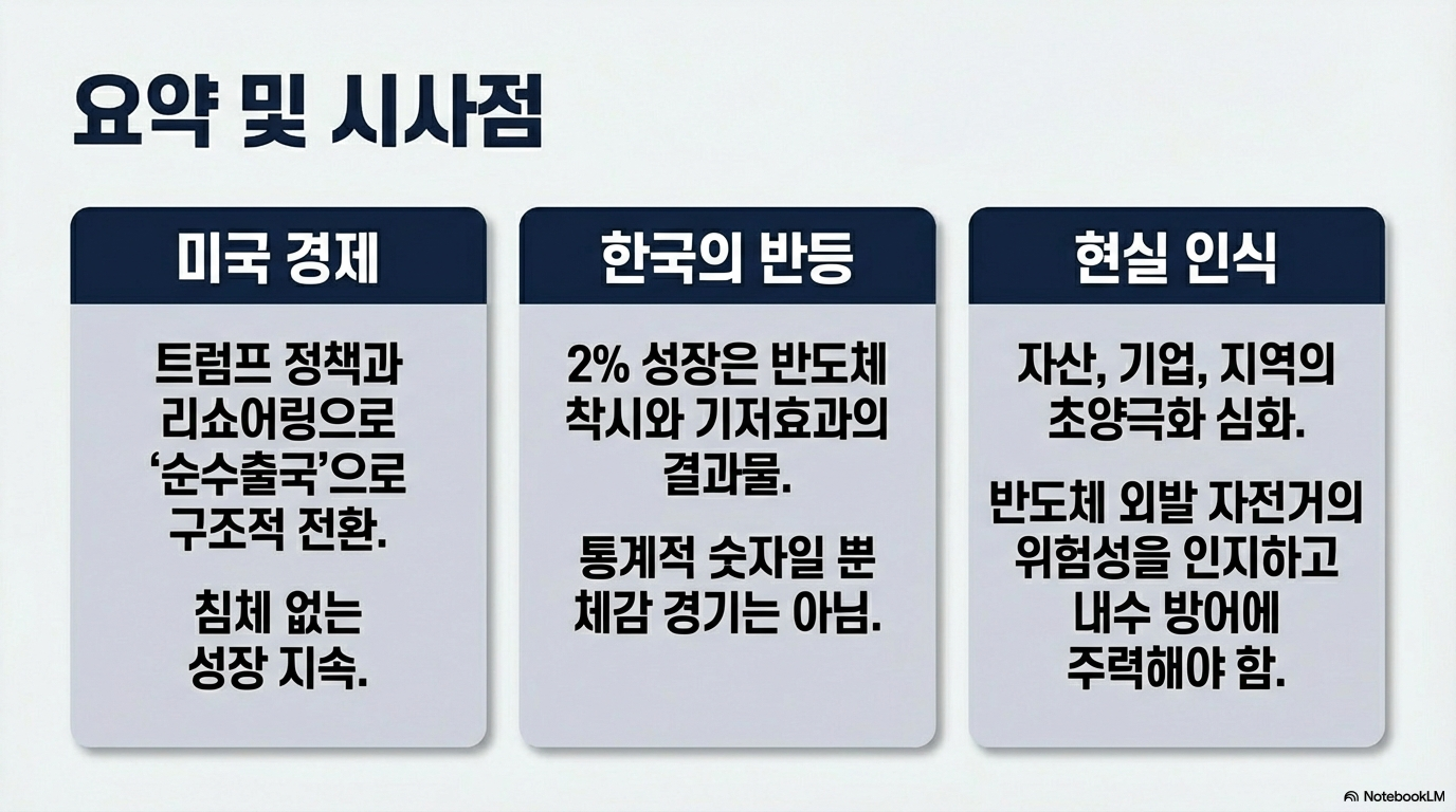 경제 성장률 2%, 사상 최고치를 경신하는 주가 지수. 이처럼 듣기 좋은 총량 지표가 주는 '착시'에 매몰되어서는 안 됩니다. 그 화려한 숫자 뒤에는 반도체라는 단일 품목에 위태롭게 의존하는 경제 구조와, 성장의 온기를 전혀 느끼지 못하는 '초양극화'의 그림자, 예측 불가능한 미국의 경제 변화, 그리고 하반기에 닥칠지 모를 '상고하저'의 함정이 도사리고 있습니다. 가장 큰 위험은 총량 지표에 매몰된 정책 당국이 "우리 경제 괜찮잖아, 뭘 더 바래?"라며 안주하는 사이, 정작 필요한 지원과 대책의 시기를 놓칠 수 있다는 점입니다.