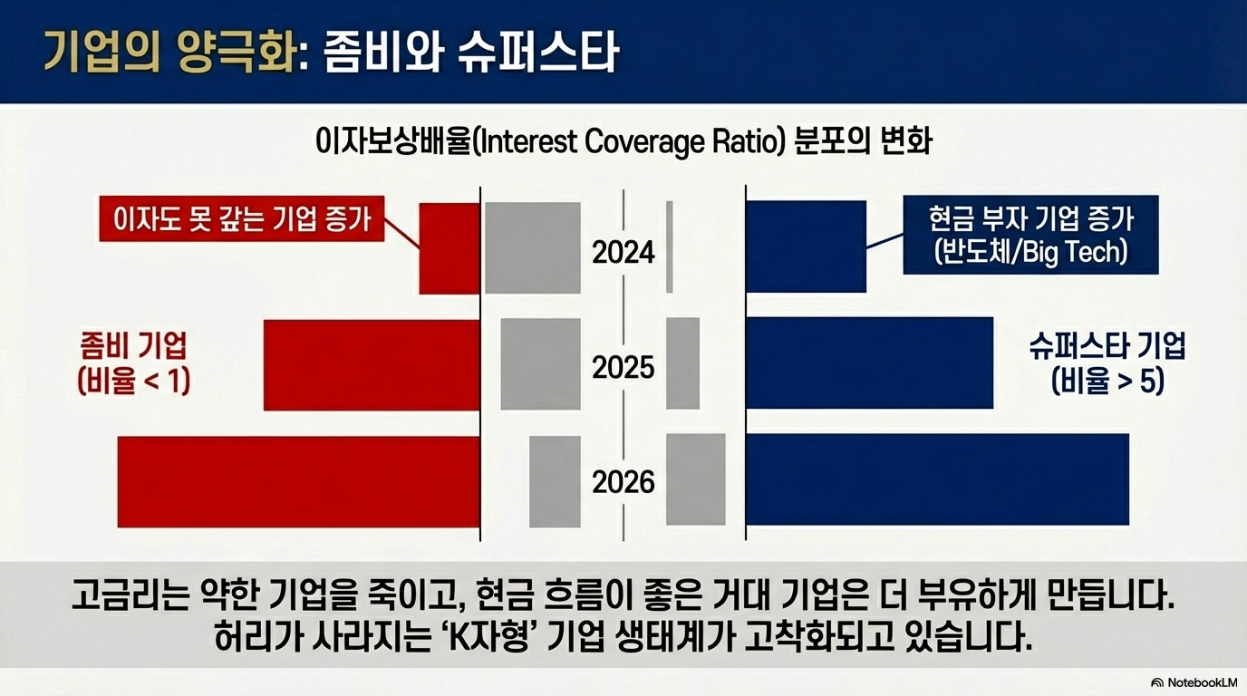 ◦ 기업: 영업이익으로 이자조차 감당하지 못하는 기업(소위 '좀비 기업', 이자보상배율 1 미만)의 비중은 계속 늘어나는 반면, 재무 건전성이 우량한 기업(이자보상배율 5 이상)의 비중은 줄어들고 있습니다.