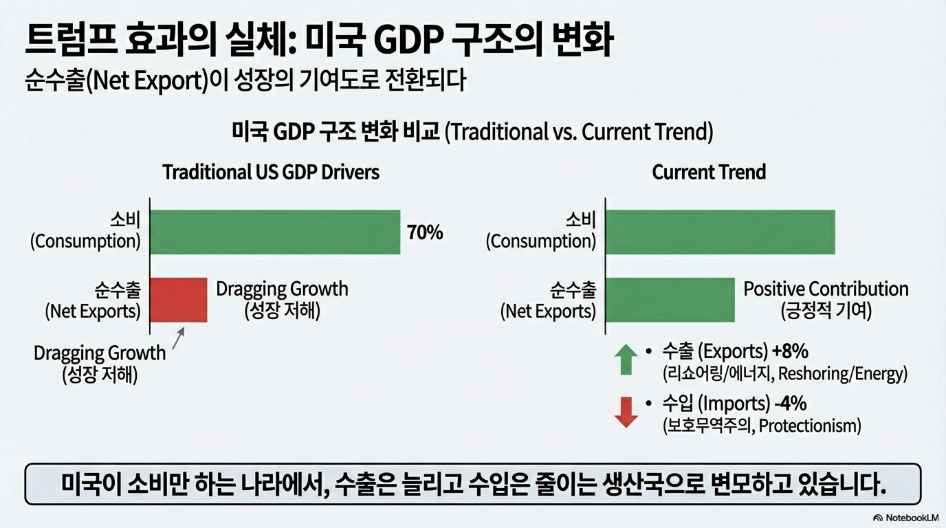 • 전통적 관념과의 차이: 미국은 전통적으로 GDP의 70%를 소비가 차지하는 '소비 중심 국가'였습니다. 하지만 최근 발표된 GDP 통계를 보면, 수출 증가율이 8%대를 기록하는 동안 수입 증가율은 -4%대를 기록하는 이례적인 현상이 나타났습니다. 미국이 수출은 많이 하고 수입은 덜 하는 구조로 변해가고 있는 것입니다.