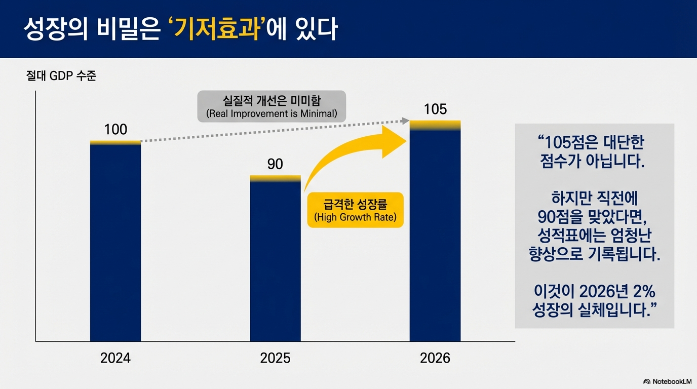 • 상반기와 하반기의 차이점: 2026년 상반기 경제 성장률은 2025년의 부진했던 경제 성과로 인한 '기저 효과(Base Effect)' 때문에 매우 높게 나타날 가능성이 큽니다. 작년 성적이 낮았기 때문에 올해 성적이 조금만 좋아져도 성장률은 크게 튀어 오르는 것입니다.