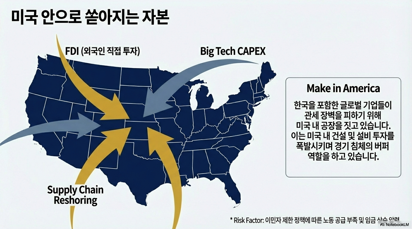 • 원인 분석: 이러한 변화의 배경에는 복합적인 요인이 작용합니다. 첫째는 트럼프 행정부 시절 관세 부과 정책으로 인한 '기저 효과'입니다. 당시 기업들이 관세를 피하기 위해 수입을 앞당기면서 일시적으로 GDP가 하락했고, 이후 수입이 급감하면서 성장률이 인위적으로 튀어 오르는 효과가 나타난 것입니다. 둘째는 보다 구조적인 변화로, 각국 기업들이 미국의 공급망 재편 정책에 따라 미국 내에 공장을 짓는 직접 투자(FDI)를 늘린 것이 장기적인 영향을 미치고 있습니다. 이는 단순한 일시적 현상이 아닌, 미국 경제 구조의 중대한 변화를 시사하는 신호일 수 있습니다.