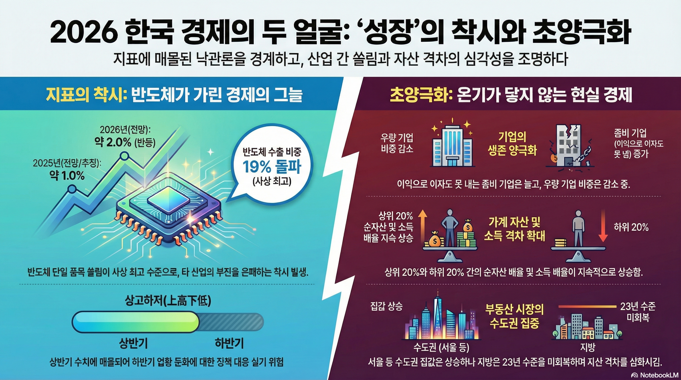 2026년 한국 경제가 2%대 성장률로 반등하고 수출이 호조를 보일 것이라는 전망의 중심에는 '반도체'가 있습니다. 긍정적으로 보이는 이 총량 지표들은 사실상 반도체 단일 품목의 이례적인 성과에 크게 의존하고 있으며, 이는 일종의 '착시' 현상을 만들어내고 있습니다.
