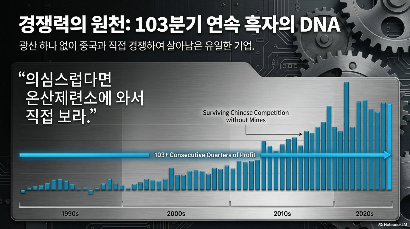반면 고려아연은 달랐다. 51년간 광산 하나 없이 오직 기술력과 효율성으로 글로벌 시장에서 살아남은 기업, 그리고 당장이라도 미국 관계자들이 방문해 눈으로 확인할 수 있는 고수익의 온산제련소라는 '작동하는 청사진'을 가진 파트너였다. 미국 입장에서 이것은 불확실한 미래에 대한 투기적 베팅이 아니었다. 반세기 동안 검증된 기술력과 수익 모델을 가진 파트너와 함께 자국 핵심 광물 공급망의 리스크를 제거하는, 가장 확실한 선택이었던 것이다.