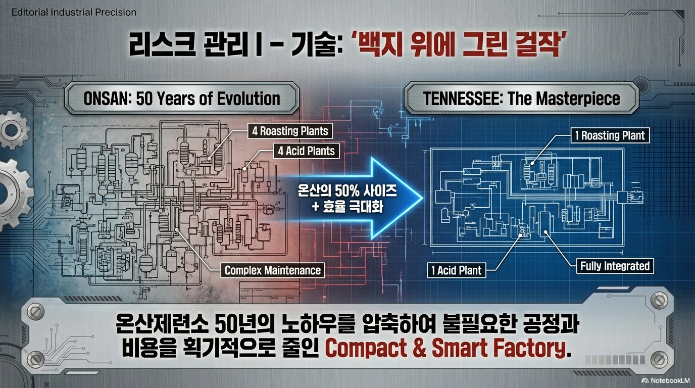 비밀은 '유기적 성장'과 '의도된 설계'의 차이에 있다. 51년 역사의 온산제련소는 강력하지만, 필요에 따라 조금씩 증축을 거듭하며 성장해 온 거대하고 복잡한 유기체와 같다. 그 결과 현재 아연 생산을 위해 4개의 배소 공장과 4개의 황산 공장이 각기 운영되는 비효율적인 구조를 안고 있다.