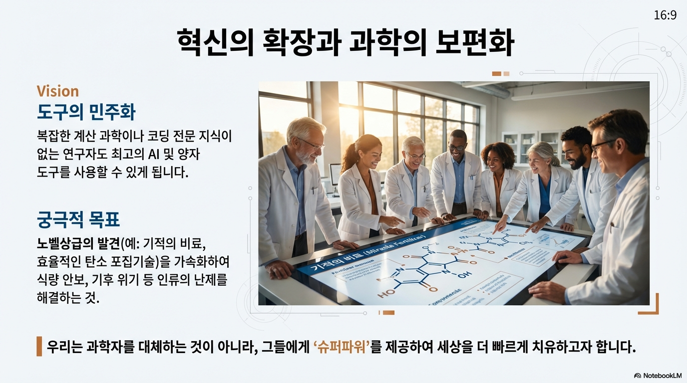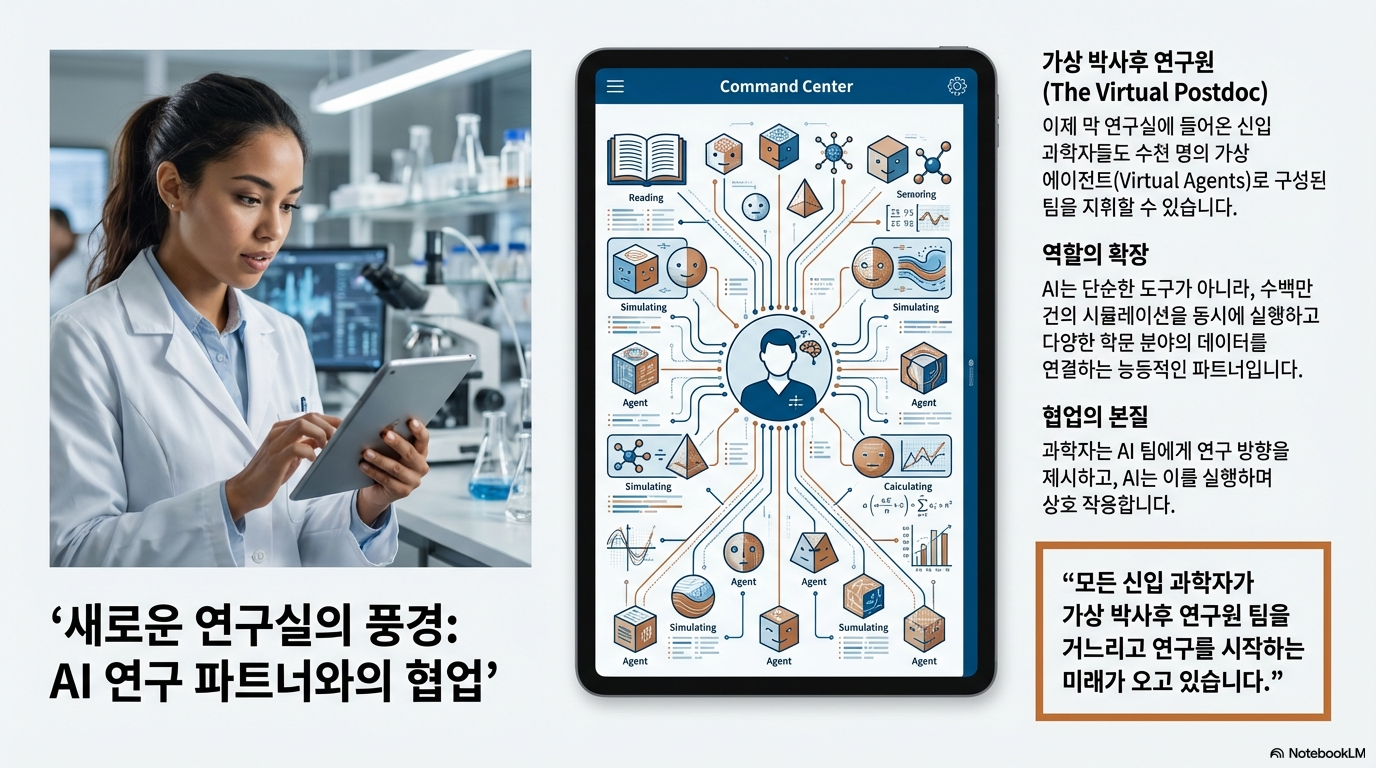 AI는 과학자를 대체하는 도구가 아니라, 인류의 의지를 증폭시키는 거대한 레버리지입니다. 가상 포스트닥 팀을 진두지휘하고, 수천만 개의 시뮬레이션을 순식간에 돌파하며, 학문 간의 사일로를 허무는 이 과정은 과학적 발견의 속도를 넘어 인류 사고의 지평을 넓히는 여정입니다. AI는 우리가 존재조차 몰랐던 현실의 조각들을 가리키는 나침반이 되어줄 것입니다.