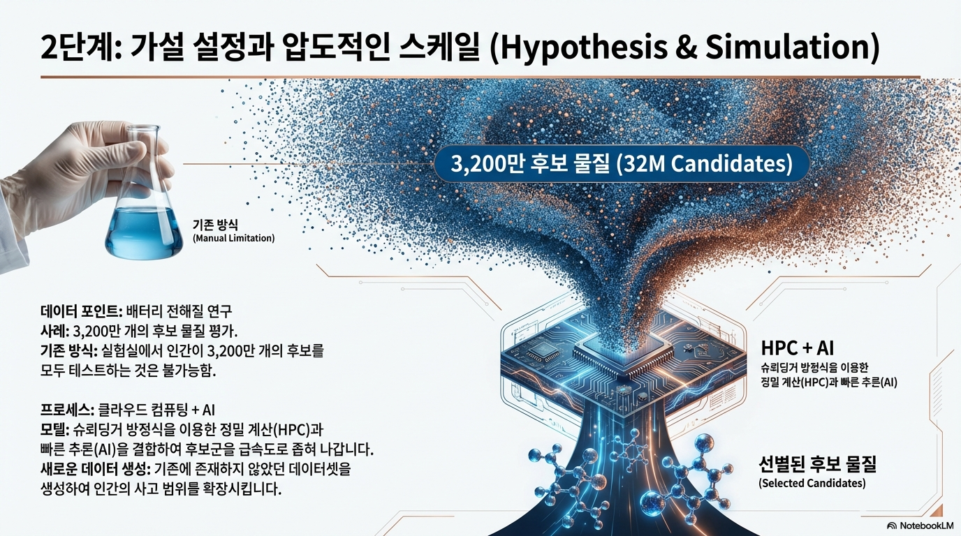 혁신은 종종 '규모(Scale)'의 벽에 가로막힙니다. 일례로 새로운 배터리 전해질을 찾기 위해 3,200만 개의 후보 물질을 검토해야 한다면, 기존의 방식으로는 수 세대의 시간이 걸렸을 것입니다. 하지만 AI는 클라우드 컴퓨팅과 결합하여 이 거대한 데이터의 양을 '가능성의 영역'으로 소환합니다.