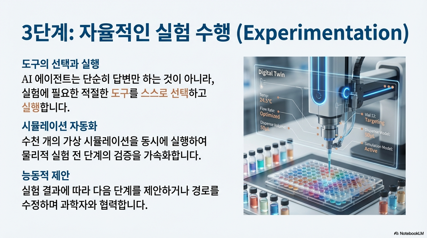 AI는 가설 생성부터 실험 설계, 도구 선택 및 실행에 이르기까지 연구의 전 과정에 개입하여 과학자의 전문 지식 공백을 즉각적으로 메워줍니다. 이는 단순한 자동화를 넘어, 한 개인의 지적 능력을 수천 배로 증폭시키는 '지능형 협업'의 완성입니다.