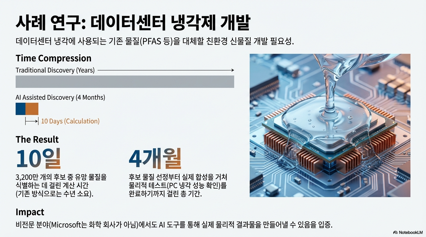 실제로 데이터 센터의 냉각제를 찾는 연구에서 AI는 단 10일 미만의 **컴퓨트 타임(Compute Time)**으로 최적의 분자 구조를 식별해 냈습니다. AI의 빠른 인퍼런싱(Inferencing, 추론) 기술을 통해 기존에 수년이 소요되던 프로세스를 단 4개월 만에 실제 합성 및 테스트 단계까지 완료한 것입니다. 인간이 물리적으로 검토할 수 없는 데이터의 규모가 AI를 만나 혁신의 실마리로 변모하고 있습니다.