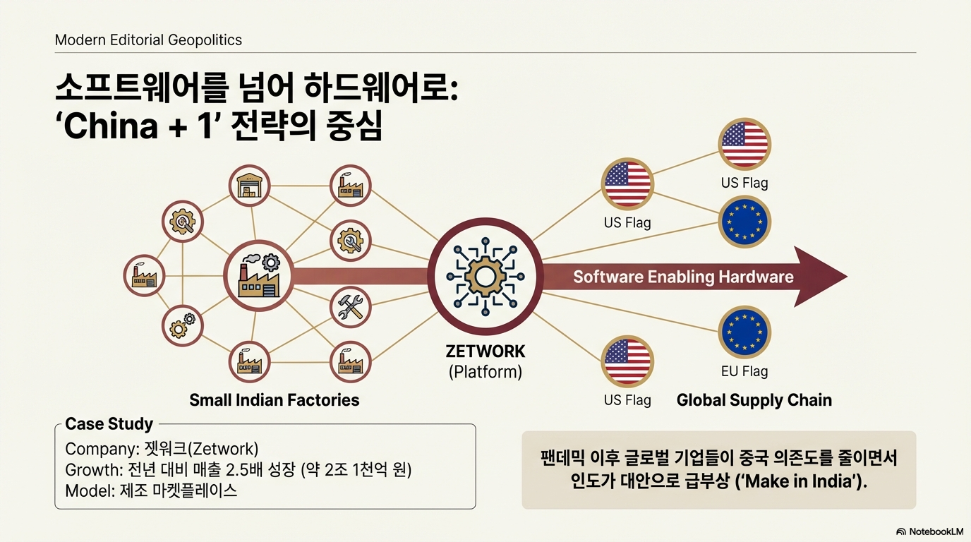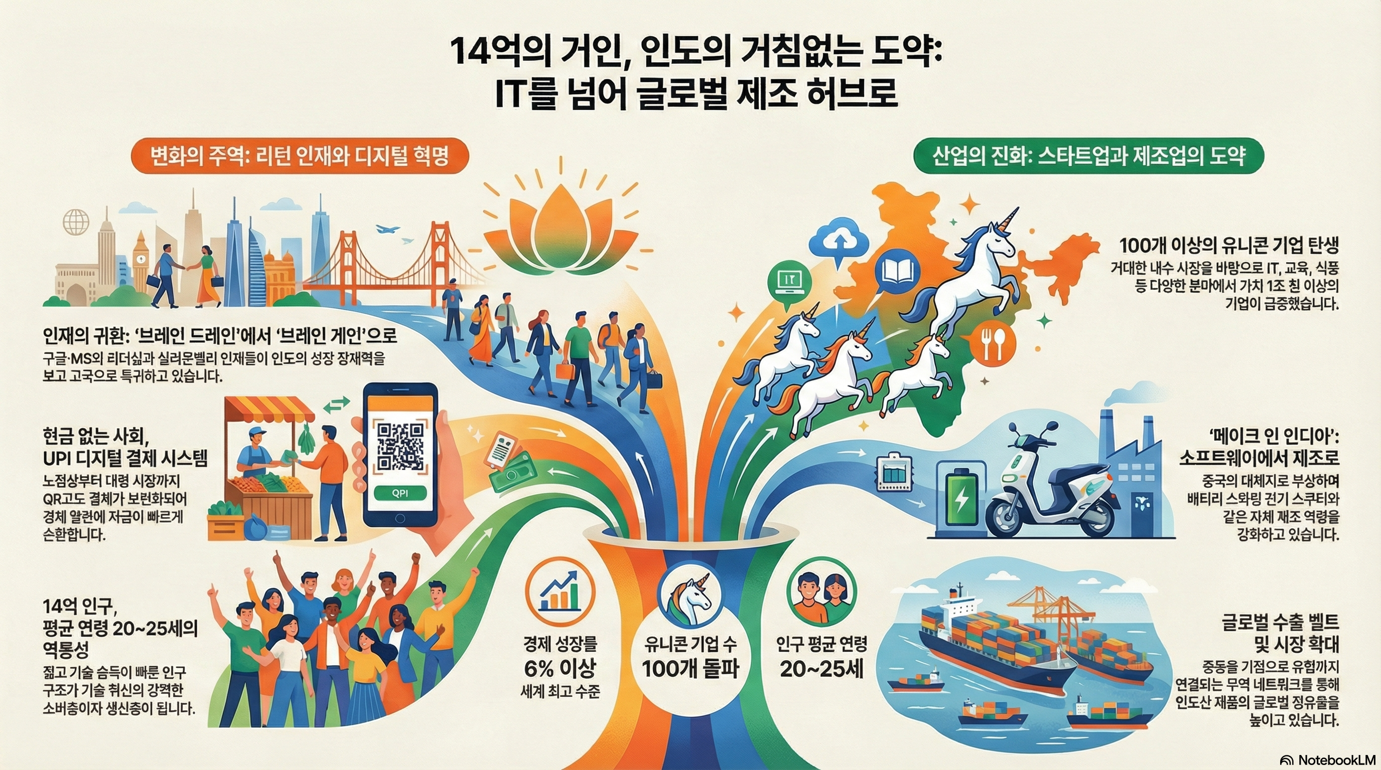 인도는 이제 소프트웨어 파워를 하드웨어 제조 역량으로 전이시키고 있습니다. 특히 글로벌 공급망 리스크와 맞물려 '차이나 플러스 원(China Plus One)' 전략의 최대 수혜지로 부상하며 제조업의 폭발적 성장을 기록 중입니다.