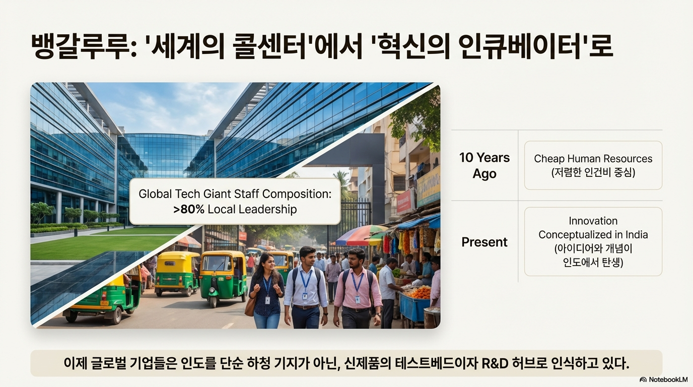 현재 뱅갈루루의 테크 기업 인력 중 약 80%가 인도 현지인들로 채워지고 있으며, 이들은 풍요로워진 내수 시장과 강력한 비즈니스 기회를 바탕으로 인도를 '기회의 땅'으로 재정의하고 있습니다.