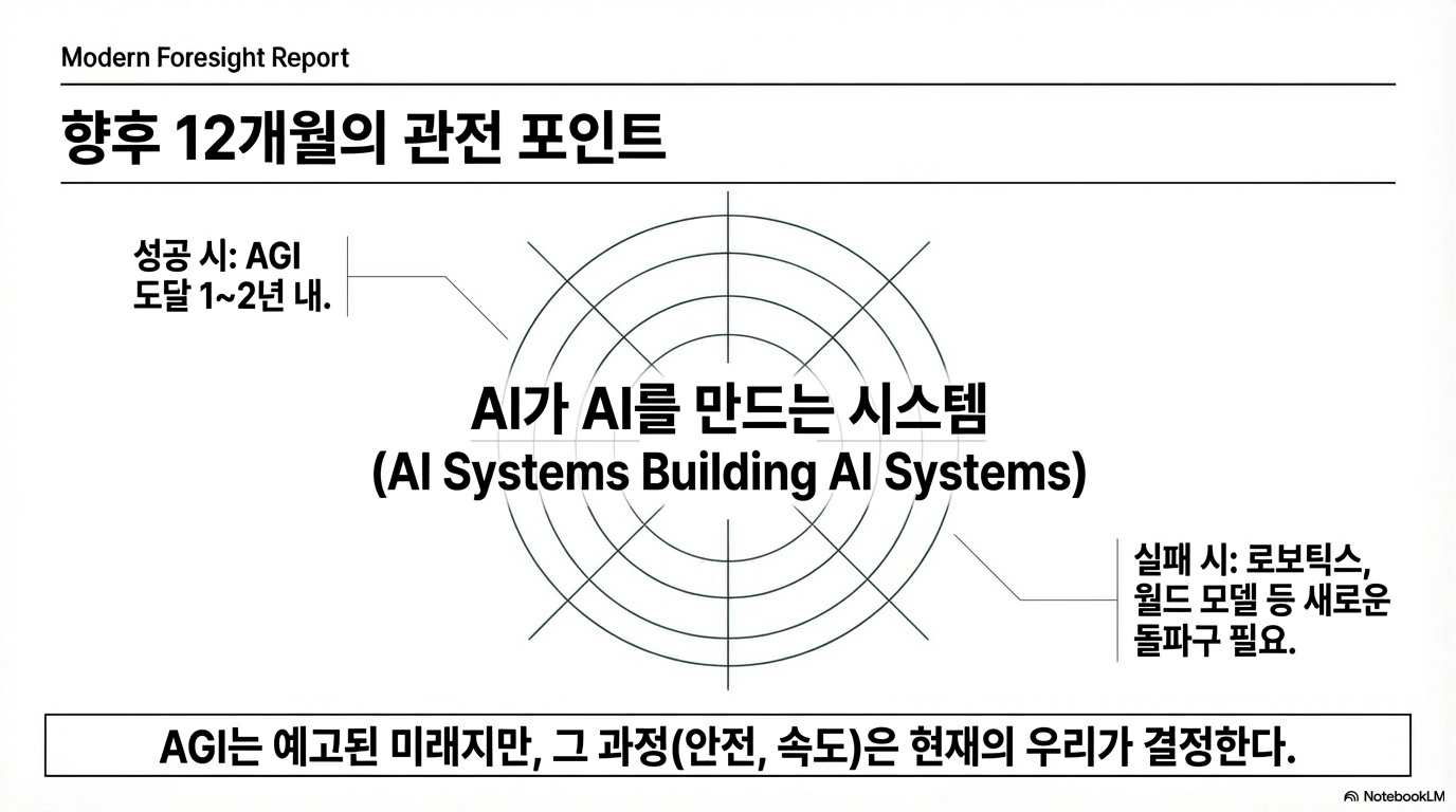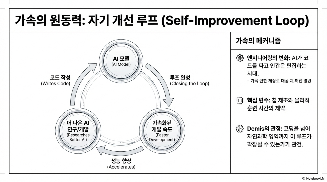 두 CEO는 앞으로 1년간 가장 중요하게 지켜봐야 할 단 하나의 변수로 '자기 개선 루프', 즉 'AI 시스템이 AI 시스템을 만드는' 기술의 실현 여부를 꼽았습니다.