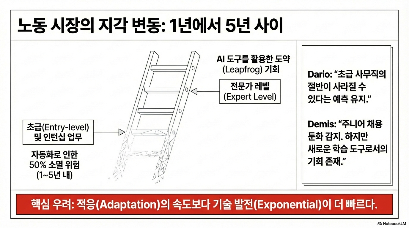 두 CEO는 AI가 노동 시장에 미치는 영향이 먼 미래의 위협이 아니라, 바로 지금 혹은 향후 1년 안에 시작될 문제라는 점에 동의했습니다. 데미스 하사비스는 이미 주니어급, 초급 화이트칼라 직무에서 "채용 둔화"가 감지되고 있다고 언급했습니다.