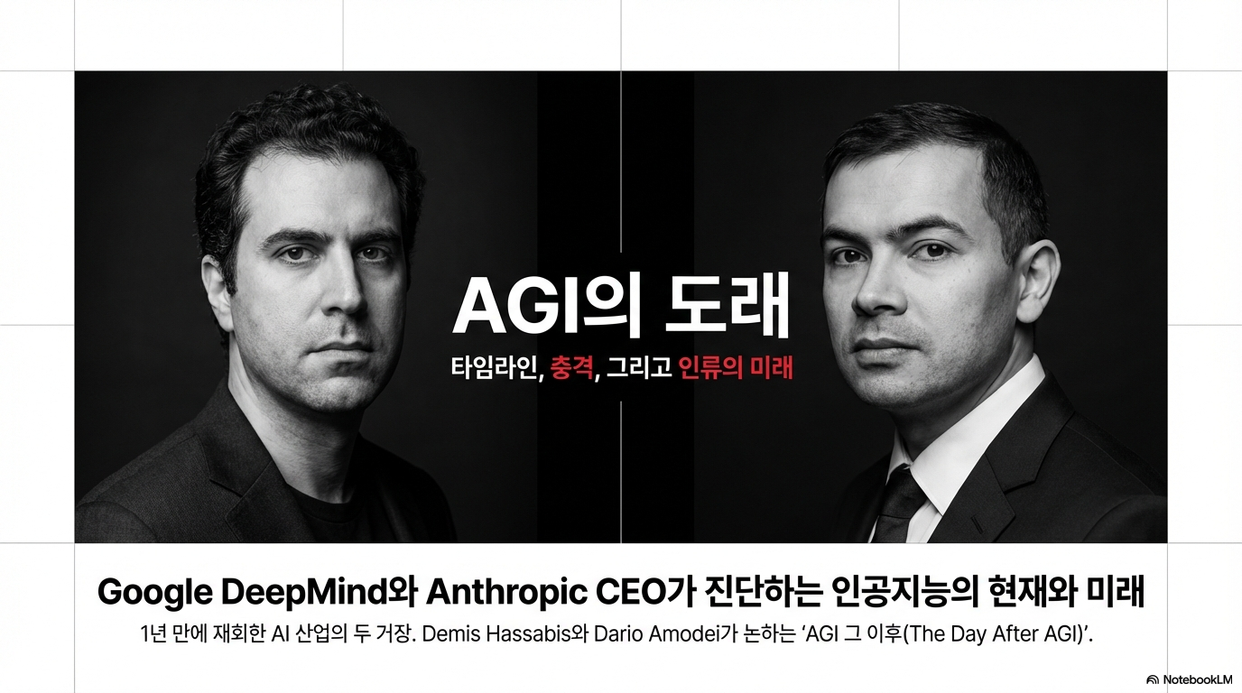 최근 AI 업계의 '비틀즈'와 '롤링스톤즈'로 비유되는 두 거물, 구글 딥마인드의 데미스 하사비스와 앤트로픽의 다리오 아모데이가 한자리에 모였습니다. 이들의 대화는 단순한 기술 토론을 넘어, 미래가 우리에게 어떤 모습으로 다가오고 있는지에 대한 커튼 뒤의 현실을 적나라하게 드러냈습니다. 대중의 추상적인 이해와 이들 창조자들이 마주한 구체적이고, 임박했으며, 실존적인 현실 사이의 아찔한 격차를 보여준 것입니다. 이 글에서는 두 CEO의 대화에서 우리가 반드시 이해해야 할 가장 놀랍고 중요한 5가지 핵심 통찰을 분석합니다.