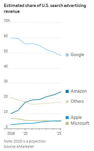 Amazon은 구글에게 가장 큰 위협 중 하나로 자리 잡았습니다. 과거에는 인터넷에서 제품 정보를 검색하거나 리뷰를 찾아볼 때 구글을 사용했지만, 이제 많은 사용자가 Amazon에서 직접 검색을 시작하고 있습니다. 이는 쇼핑 검색 분야에서 구글의 역할을 대체하고 있으며, 자연스럽게 광고주들도 Amazon으로 이동하게 만드는 결과를 초래했습니다. eMarketer에 따르면, 2025년까지 구글의 미국 검색 광고 시장 점유율은 50% 이하로 감소할 것으로 전망됩니다. 이는 구글의 광고 수익 기반이 심각하게 흔들릴 수 있음을 보여줍니다.