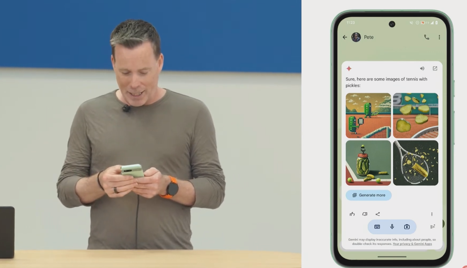 • AI와의 실시간 상호작용: 새로운 Pixel 8A 기기를 사용하여 Gemini AI와의 실시간 상호작용을 시연하였습니다. 사용자는 앱을 사용하면서 AI에게 질문을 하거나, 도움을 요청할 수 있습니다. 예를 들어, 친구에게 유머러스한 메시지를 보내기 위해 "피클과 테니스" 이미지를 생성해 달라고 요청하면, AI가 즉시 이미지를 생성하여 메시지 앱에 드래그 앤 드롭할 수 있습니다.