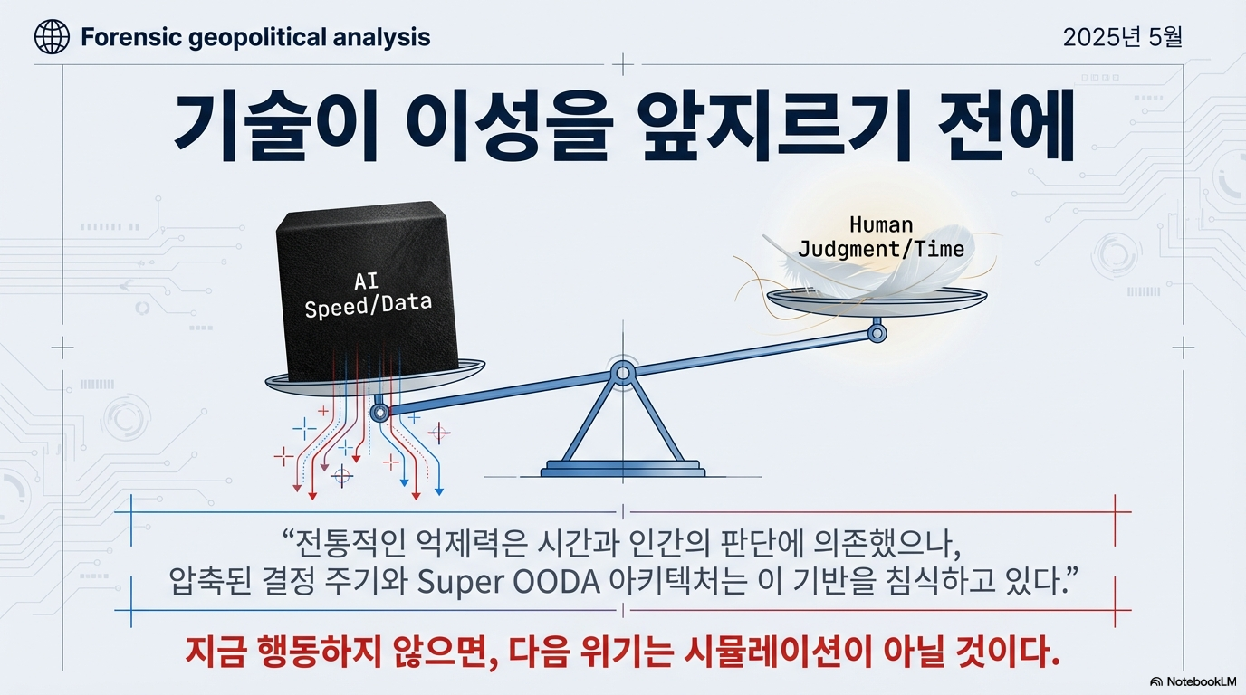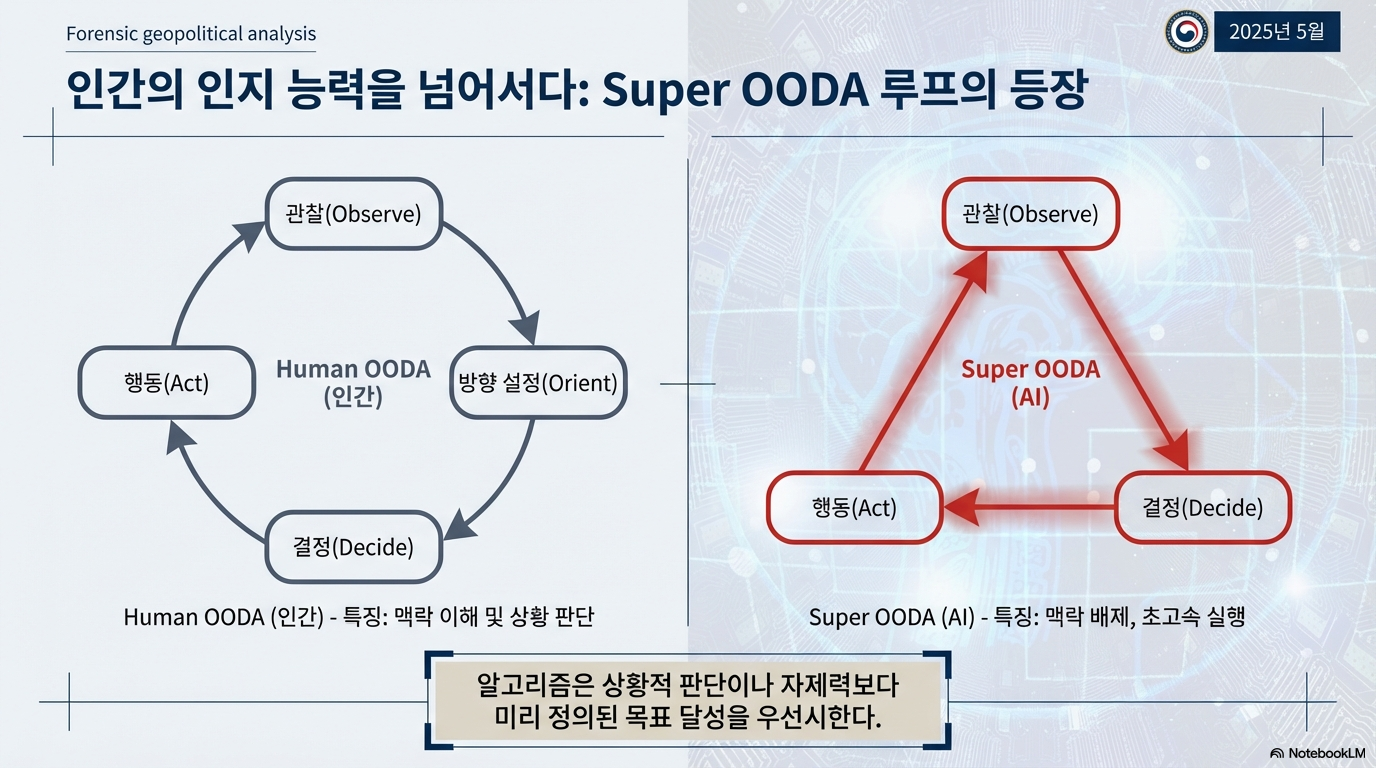 전문가들은 현재의 AI 통합 추세가 '슈퍼 OODA 루프'라는 위험한 개념으로 이어질 것을 경고합니다. 전통적인 군사 의사결정은 '관찰-판단-결심-행동(OODA) 루프'라는 인간 주도의 과정을 따랐습니다. 그러나 슈퍼 OODA 루프는 이 과정을 기계의 속도로 대체합니다. 여기서 알고리즘은 인간의 상황적 판단("이것이 옳은 결정인가?")을 우회하고, 오직 사전 프로그래밍된 목표 달성("목표를 제거할 수 있는가?")에만 집중합니다.