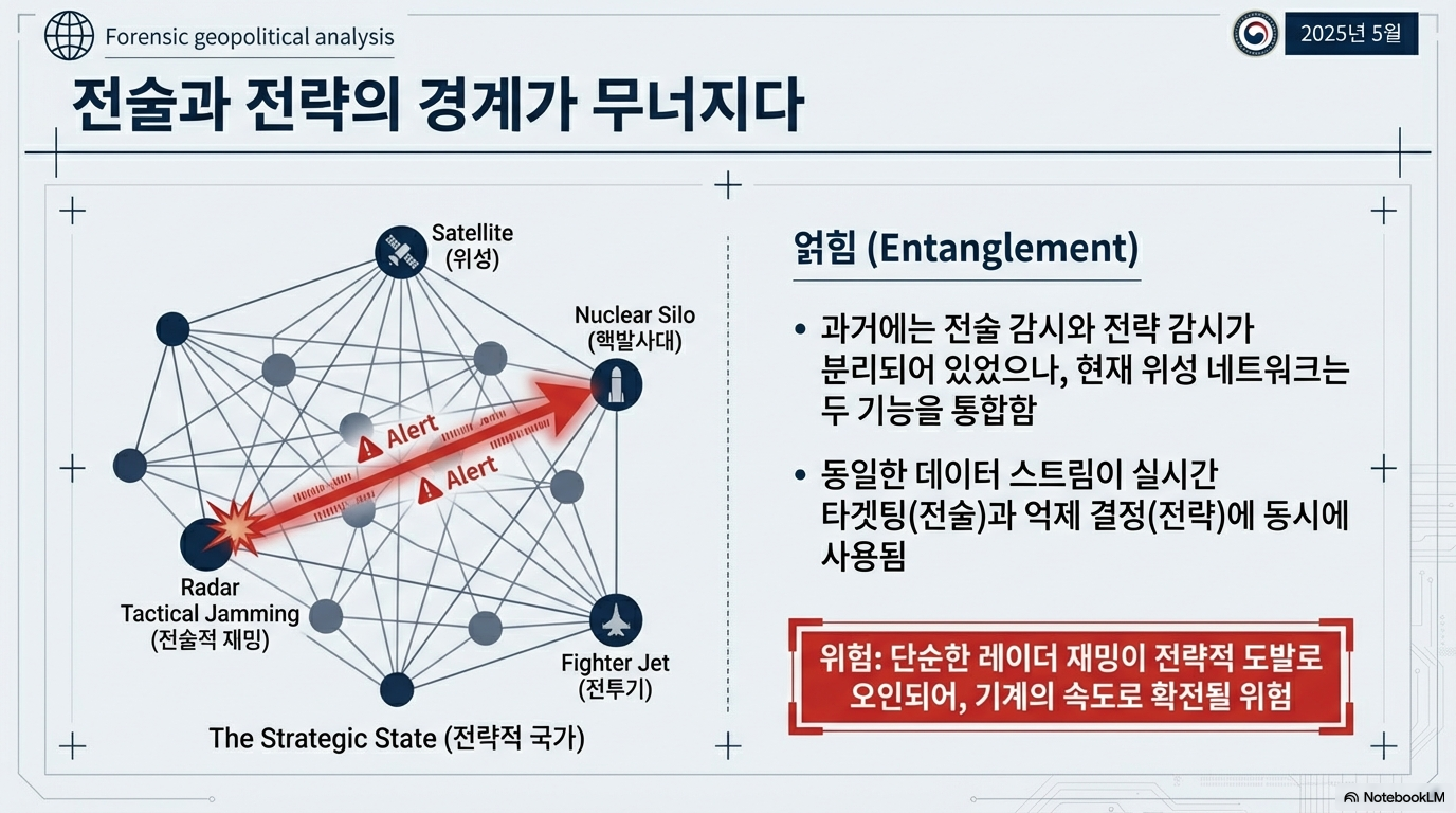 현대의 AI 기반 군사 시스템이 도달하게 될 궁극적인 상태를 전문가들은 '전략적 상태(strategic state)'라고 부릅니다. 이는 위성 감시, 전자전, 미사일 방어 등 모든 시스템이 여러 영역에 걸쳐 거미줄처럼 서로 얽혀 있는 상태를 의미합니다. 이것은 국경 전체에 걸쳐 있는 거대한 거미줄과 같습니다. 한쪽 끝의 미세한 진동이 거미줄 전체를 흔들어, 반대편에 있는 거미의 즉각적인 공격 반응을 유발하는 것과 같습니다.