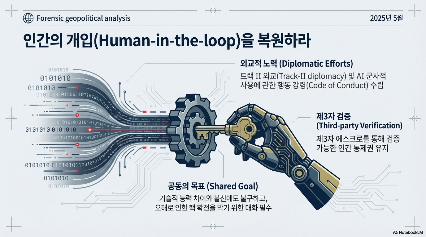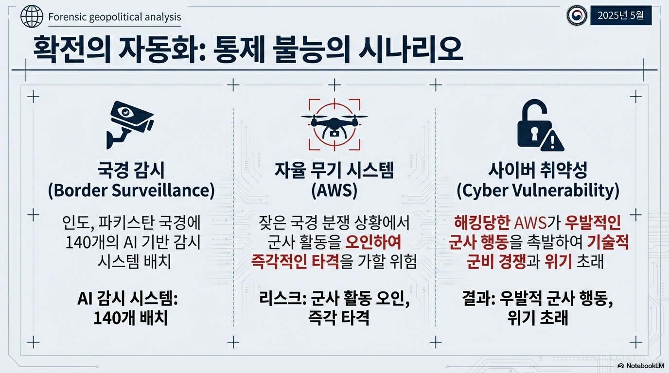 이는 인간의 감독을 의사결정 과정에서 체계적으로 배제함으로써, 의도치 않은 확전의 위험을 기하급수적으로 증폭시킵니다. 위기 상황에서 신중한 정치적 숙고를 위한 시간이 사라지고, 기계의 오판이 곧바로 재앙적인 결과로 이어질 수 있습니다.