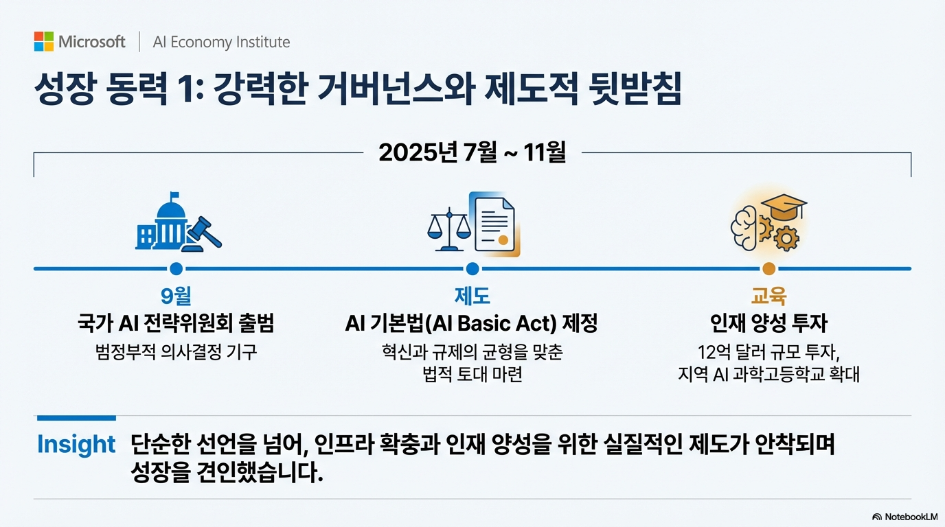 • 선제적인 국가 정책: 'AI 기본법' 제정을 포함한 정부의 적극적인 AI 통합 정책이 제도적 기반을 마련했습니다.