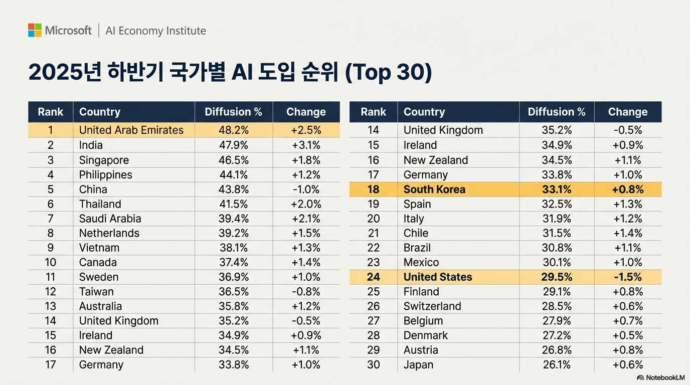보고서에서 가장 놀라운 발견 중 하나는 바로 미국에 관한 것입니다. 미국은 세계 최고의 AI 인프라를 구축하고 최첨단 파운데이션 모델 개발을 주도하고 있음에도 불구하고, 실제 국민들의 AI 활용률은 현저히 낮았습니다. 미국의 생산가능인구 AI 사용률은 28.3%에 그쳐, 글로벌 순위가 23위에서 24위로 오히려 한 계단 하락했습니다.