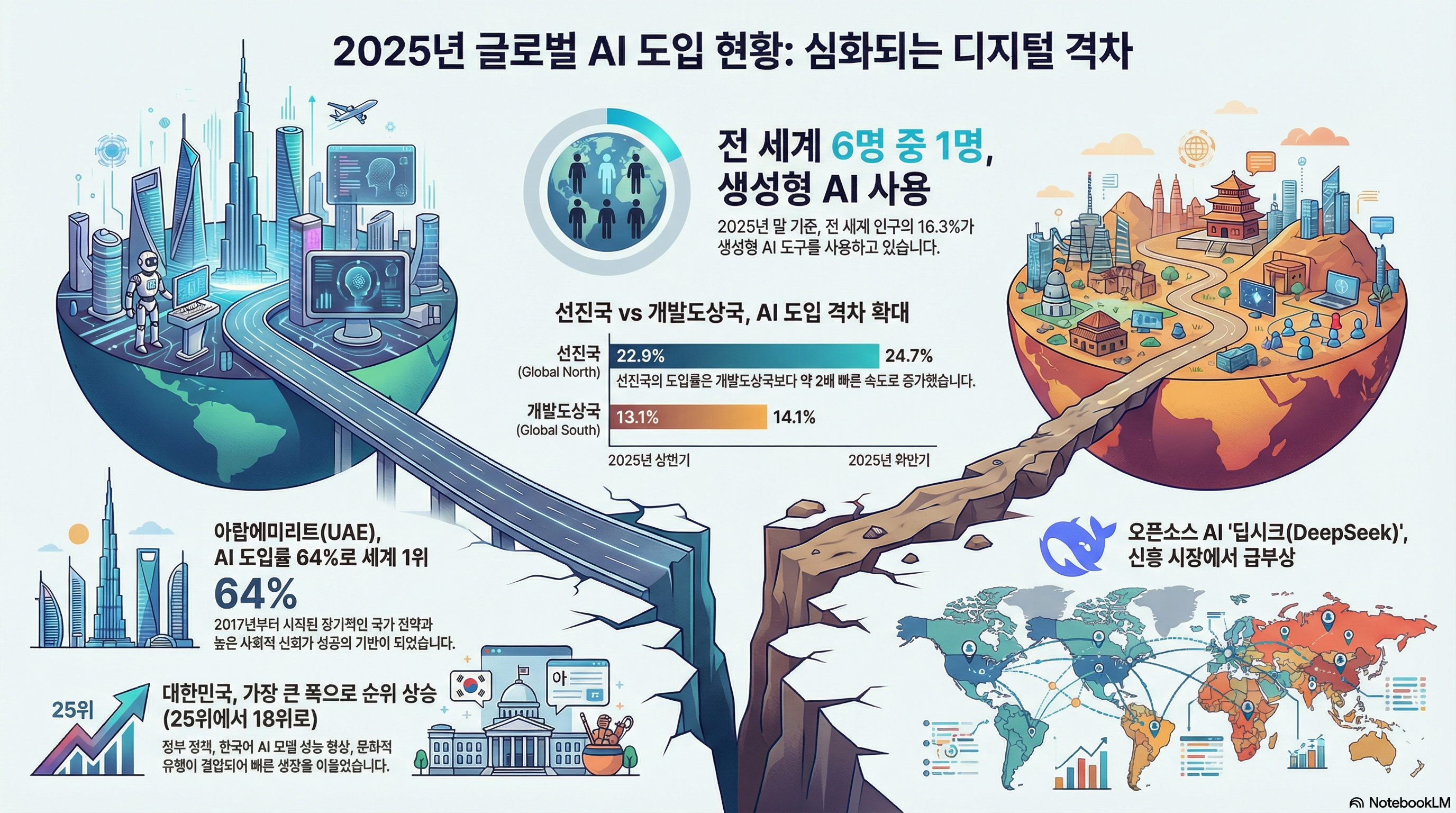 보고서에 따르면, 2025년 말 기준 전 세계 생성형 AI 채택률은 16.3%에 도달했습니다. 하지만 그 혜택은 고르게 분배되지 않고 있습니다. 선진국 그룹(Global North)의 채택률은 24.7%에 달하는 반면, 개발도상국 그룹(Global South)은 14.1%에 머물렀습니다. 더 심각한 것은 이 격차가 점점 더 벌어지고 있다는 점입니다. 2025년 하반기 동안 선진국의 AI 채택률은 개발도상국보다 거의 두 배나 빠른 속도로 증가했습니다.