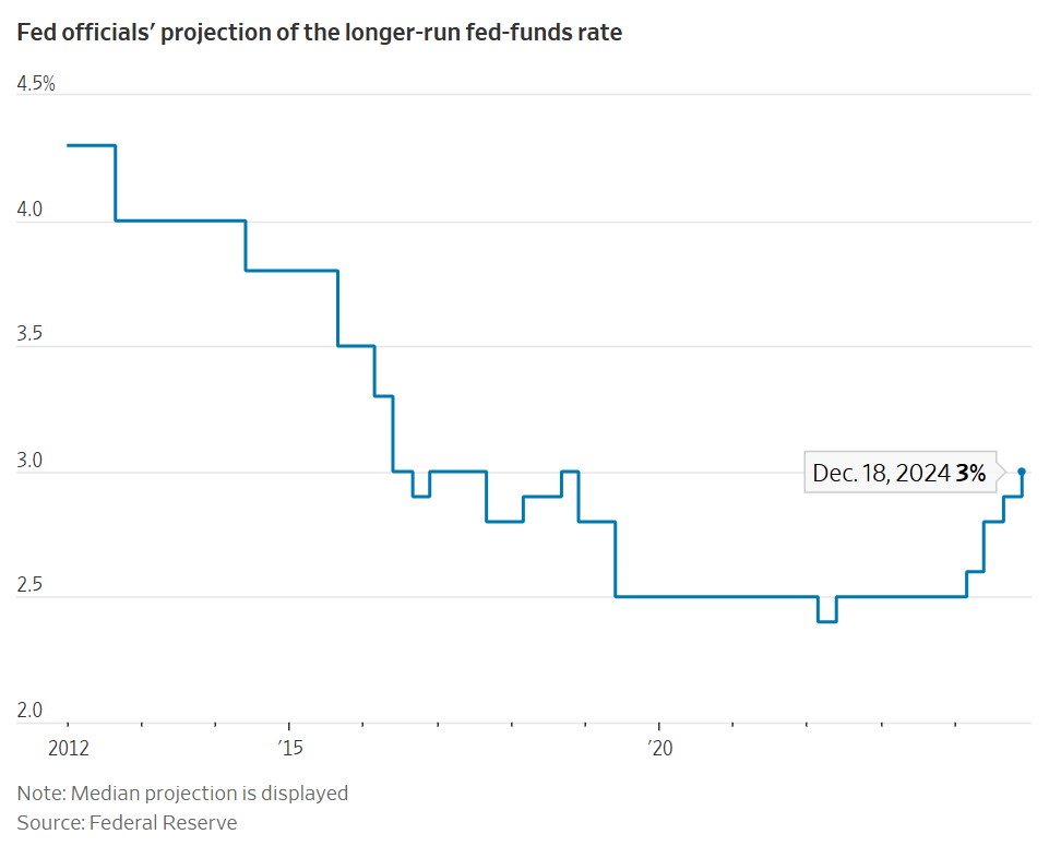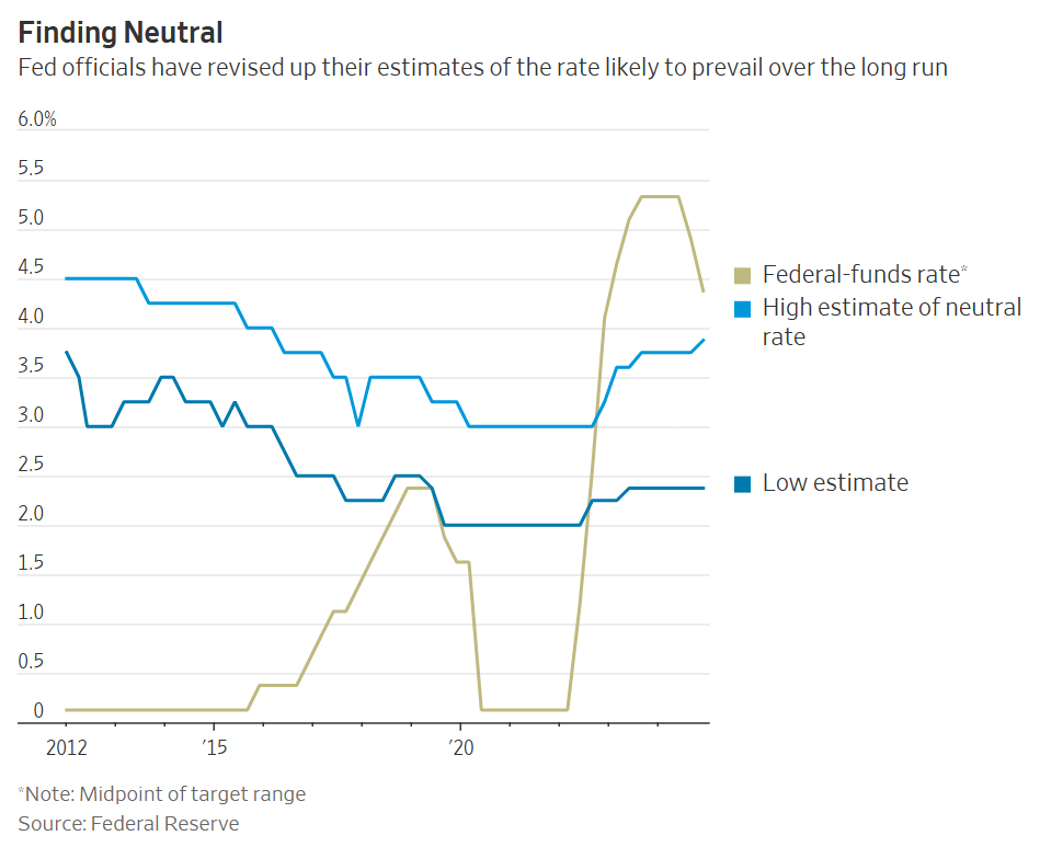 최근 몇 년 동안 연준의 중립 금리 추정치는 점진적으로 상승해왔습니다. 2023년까지 중립 금리는 2.5%로 유지되었으나, 올해 발표된 네 차례의 분기별 전망에서는 3%로 상승했습니다. 19명의 연준 관계자 중 8명은 중립 금리가 3%를 초과할 것으로 보고 있습니다.