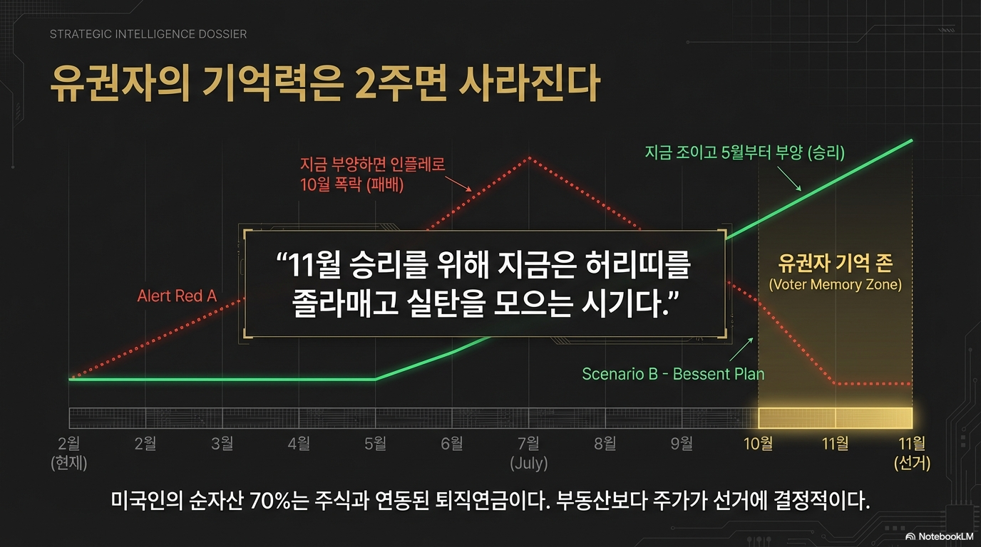 미국인의 자산 구조는 부동산 비중이 높은 한국과 달리, **순자산의 약 30%**가 주식과 퇴직 연금에 집중되어 있습니다. 주가는 곧 그들의 삶이자 표심입니다. 문제는 유권자의 기억력이 **'단 1~2주'**밖에 지속되지 않는다는 사실입니다. 베센트는 2월의 주가보다 10월과 11월 초의 주가가 선거 승리에 절대적이라는 것을 잘 알고 있습니다. 지금 주가를 띄워봐야 탄약만 소진될 뿐, 정작 선거철에 조정이 오면 정권을 뺏길 수 있습니다. 즉, 지금은 승리를 위한 '실탄 장전'의 시기입니다.