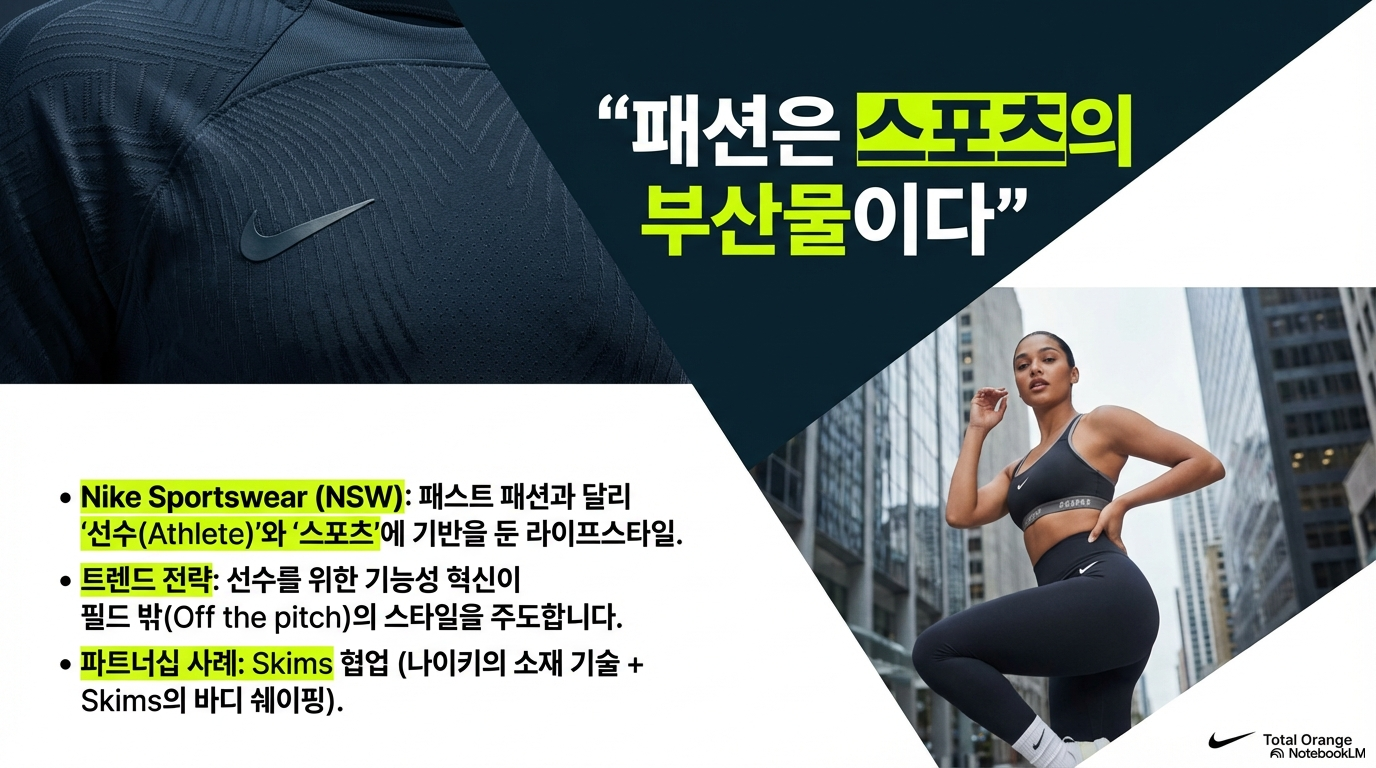 전략적 통찰: 나이키는 패션과 라이프스타일을 거부하는 것이 아니라, 그것을 '스포츠'라는 본질적 렌즈를 통해 투영하고 있습니다. 탄소판이 삽입된 **'알파플라이(Alphafly)'**처럼 압도적인 기술력이 뒷받침될 때, 나이키의 스타일은 비로소 대체 불가능한 권위를 갖게 된다는 계산입니다.