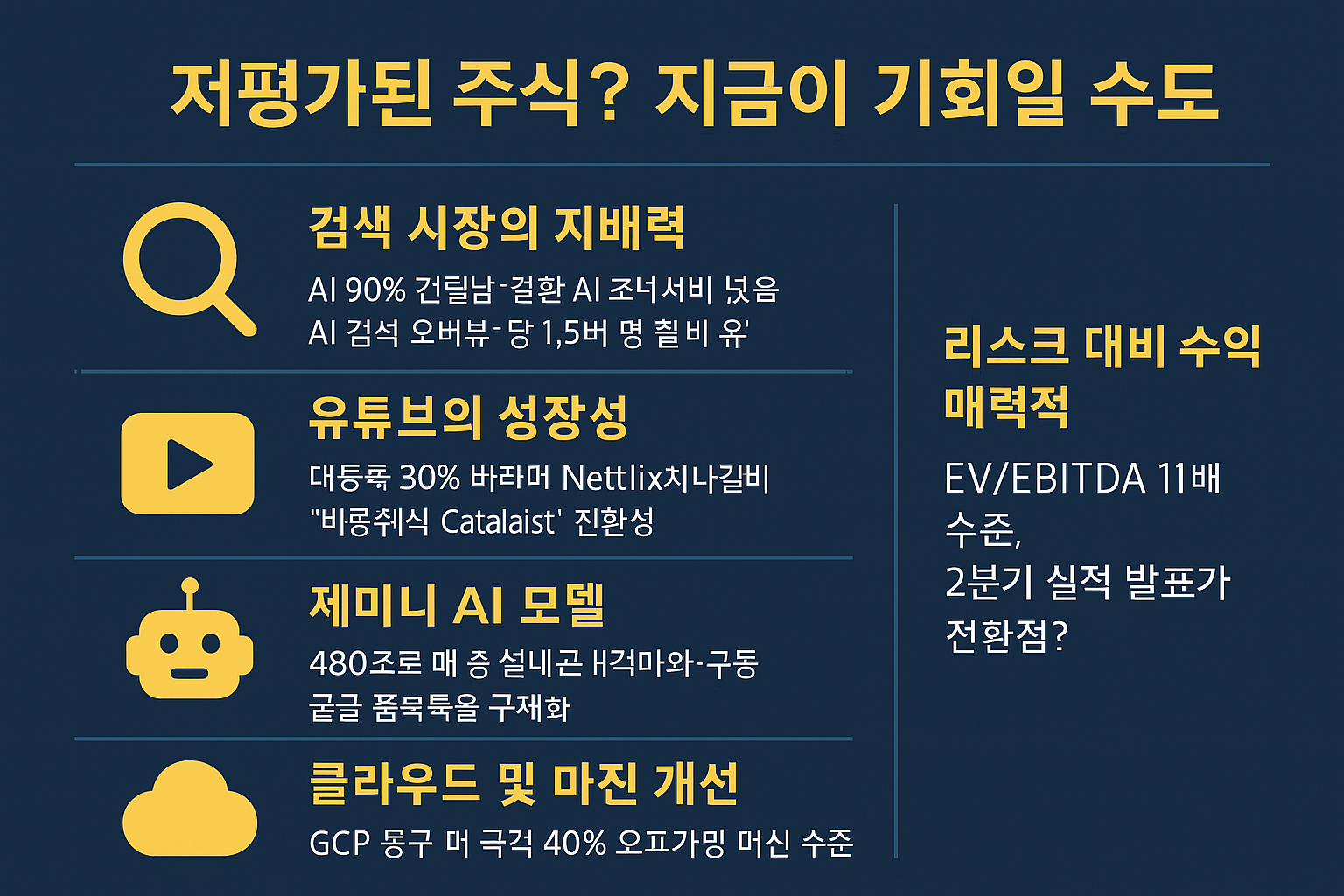이 블로그에서는 그 근거가 되는 핵심 요소들을 하나씩 짚어보며, 지금이야말로 ‘저평가된 기회주’로서의 구글을 다시 조명할 시점임을 살펴보려 합니다.
