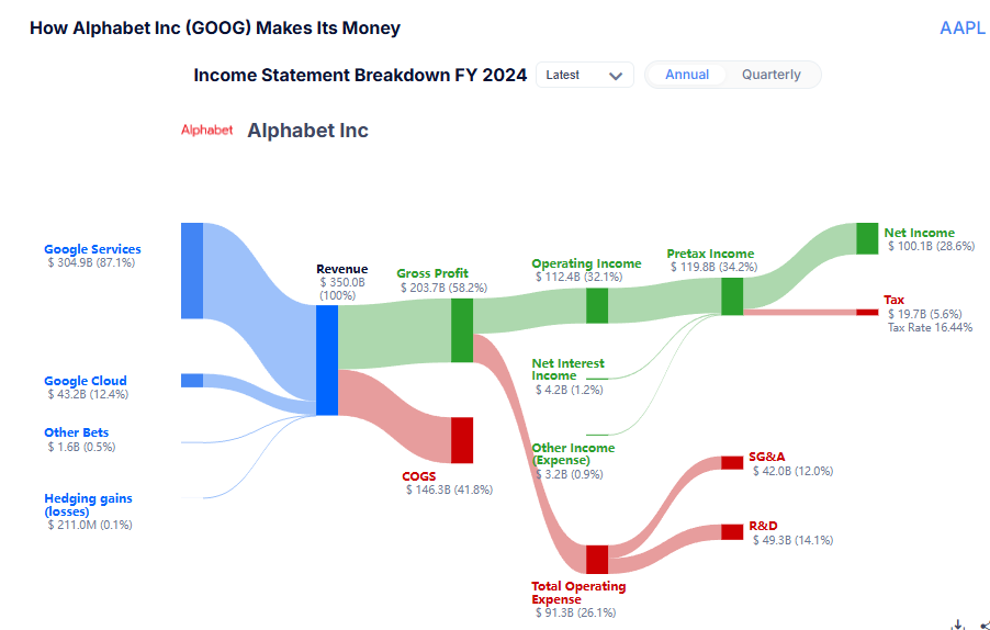 2025년 1분기, 알파벳의 **영업이익률(Operating Margin)은 40%**로 사상 최고치를 기록했습니다. 또한 2024년 전체를 기준으로 볼 때 EBITDA 마진은 300bp(3%) 확대되었는데, 이는 구조조정(인력 감축, 저효율 사업 정리 등)과 AI 자동화 도입이 주효했던 것으로 분석됩니다.