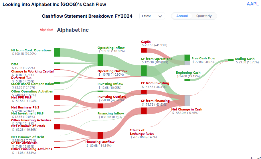 2025년 1분기 기준, 알파벳의 영업이익률은 사상 최고인 40%를 기록했습니다. 2024년에는 EBITDA 마진이 300bp(3%) 증가했으며, 이는 구조조정(인력 감축, 인건비 절감)과 AI 기반 효율화 덕분입니다. 여기에 순현금 보유액은 840억 달러에 달해, 자사주 매입 및 혁신 투자가 충분히 가능한 안정된 재무 구조를 보유하고 있습니다.