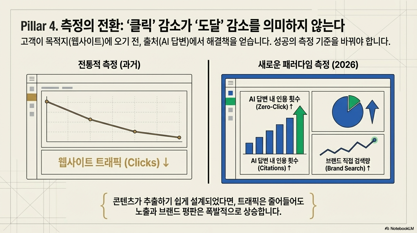 - KPI의 재정의: 단순 클릭률(CTR)에 일희일비하지 마십시오. 이제는 **'AI 인용 횟수'**와 **'브랜드 언급량'**이 성공의 새로운 지표입니다.