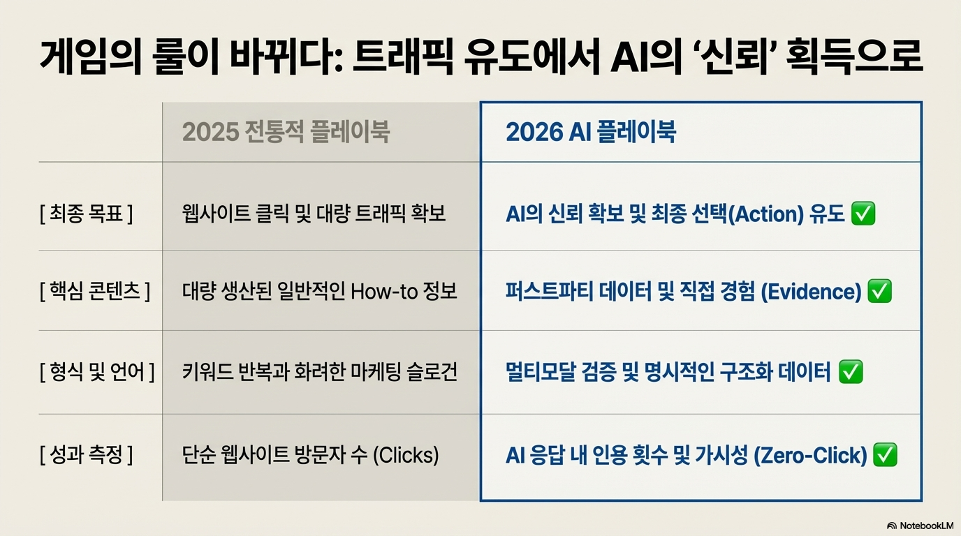 2026년에는 사용자가 웹사이트에 방문하지 않고 AI 플랫폼 내에서 정보를 소비하는 '제로 방문(Zero-Visit)'이 일상이 될 것입니다. 이제 웹사이트는 최종 목적지가 아니라 AI 답변을 구성하는 **'데이터 공급원'**으로 관점을 전환해야 합니다.