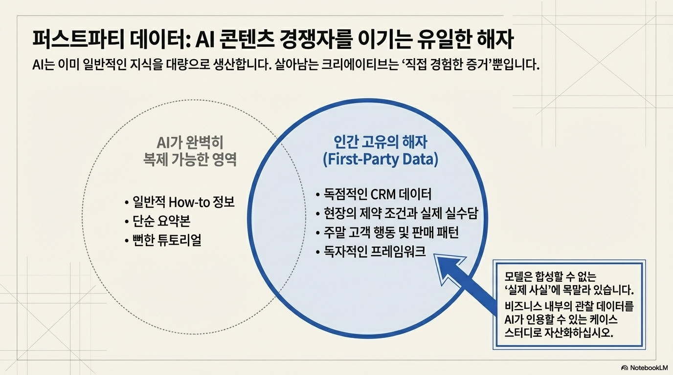 AI 모델은 이미 인터넷상의 일반적인 정보를 모두 학습했습니다. 따라서 흔한 '방법(How-to)' 콘텐츠로는 가치를 증명할 수 없습니다. 오직 비즈니스 현장에서 발생하는 직접적인 경험, 고유한 고객 패턴, 독점적인 운영 데이터만이 AI가 합성해낼 수 없는 **'원본 증거'**로서의 가치를 가집니다.