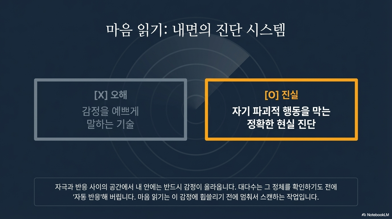 우리는 보통 자극이 오면 즉각적으로 화를 내거나, 도망치거나, 자책하는 '자동 반응'에 몸을 맡깁니다. 하지만 이 찰나의 공간을 인지하는 순간, 우리는 비로소 삶의 주도권을 쥐게 됩니다. 이 빈 공간을 무엇으로 채울 것인가? 바로 여기서 '마음 읽기'라는 도구가 필요합니다. 마음 읽기는 이 공간 속에서 우리가 길을 잃지 않도록 돕는 나침반이자, 나를 위한 최선의 반응을 선택하게 하는 조종석과 같습니다.