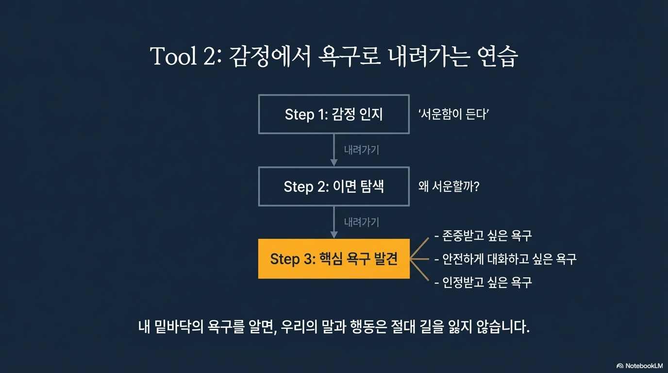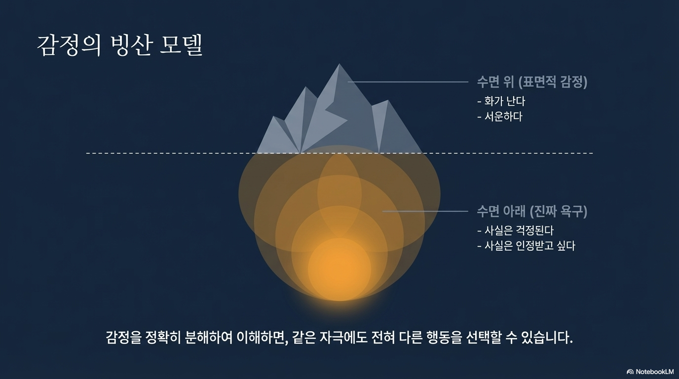 먼저, 감정에 이름을 붙여보세요. "지금 내 기분이 어떻지?"라고 묻고 정확한 단어를 선택하는 것입니다. "회의 때 내 의견이 무시당한 것 같아 서운하다"처럼 이유를 함께 적는 것이 좋습니다. 여기서 한 걸음 더 나아가, 감정 아래 숨겨진 **'욕구'**를 들여다봐야 합니다. 서운함이라는 감정 밑에는 '존중받고 싶은 욕구'나 '소중하게 대접받고 싶은 마음'이 숨어 있을 수 있습니다.