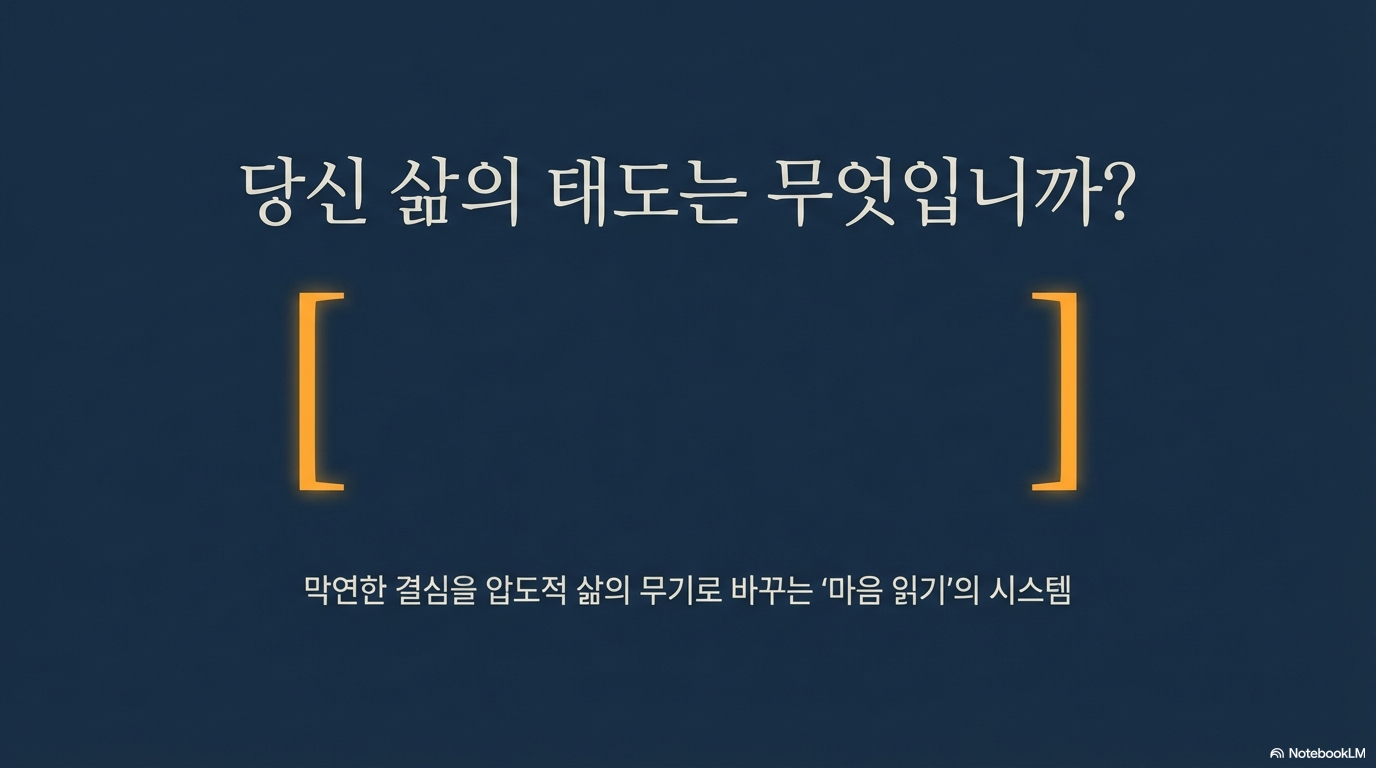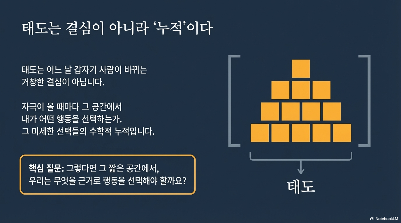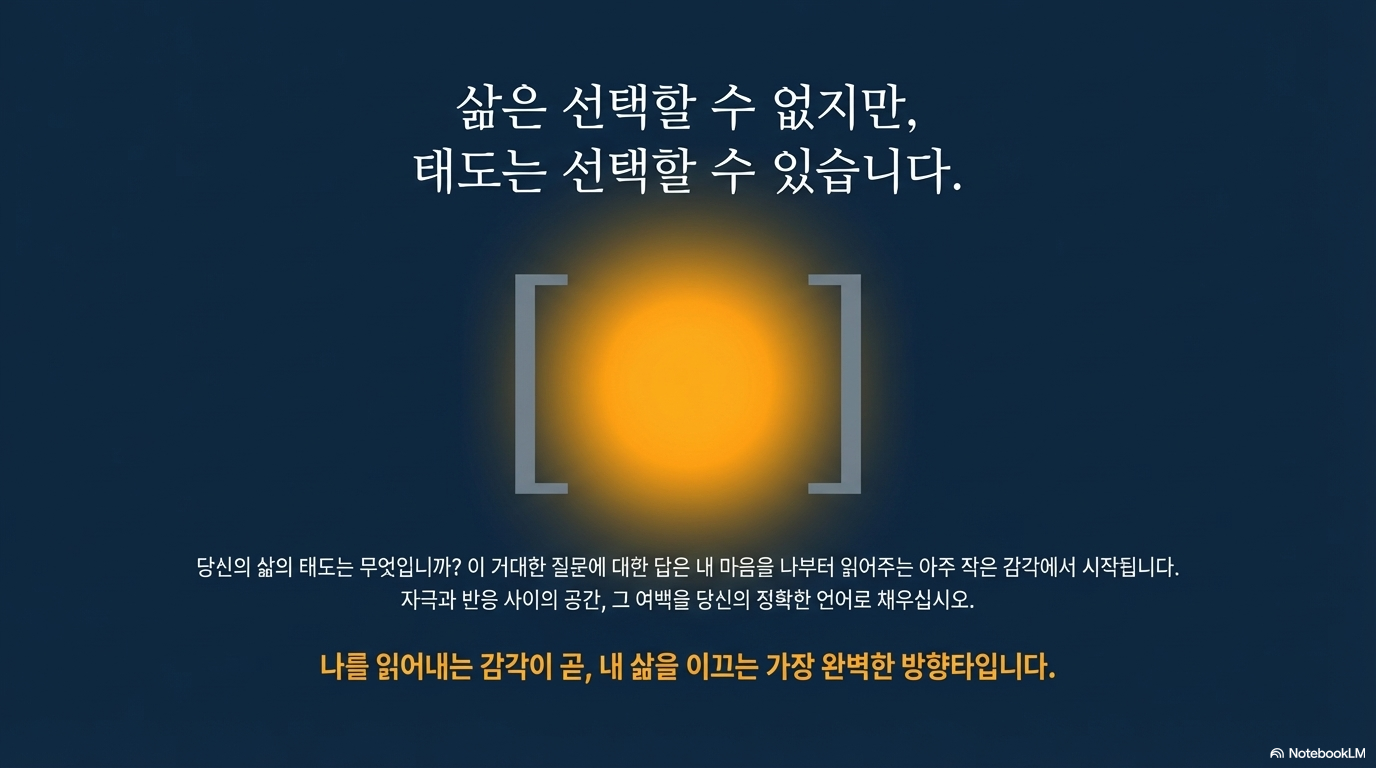 태도란 머릿속에 저장된 관념이 아니라 하루하루의 선택과 말투 속에서 증명되는 것입니다. 오늘 당신이 마주할 수많은 자극 앞에서, 잠시 멈추어 스스로에게 물어보십시오.