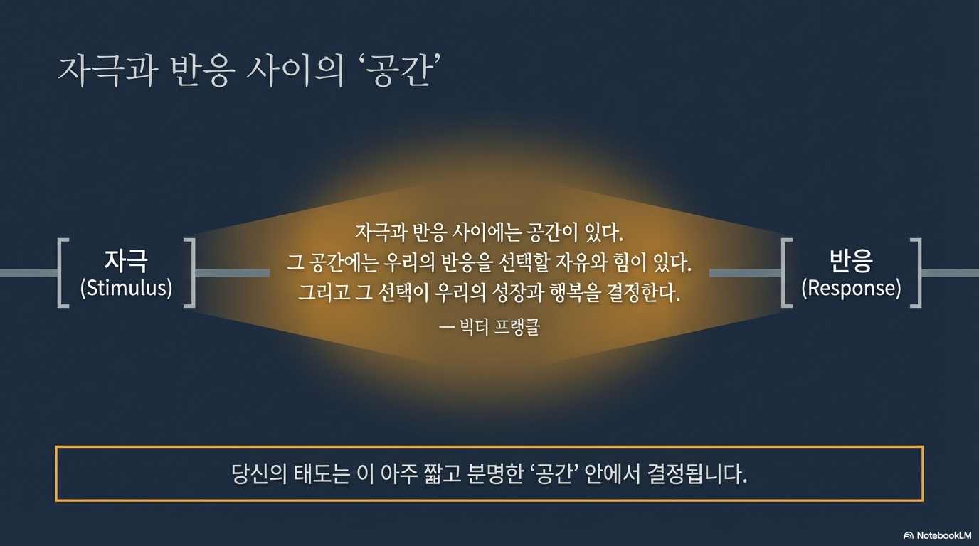 우리의 삶을 결정짓는 것은 외부의 자극 그 자체가 아니라, 그 자극에 대응하는 우리의 ‘반응’입니다. 빅터 프랭클은 이 메커니즘을 다음과 같이 명쾌하게 정의했습니다.
